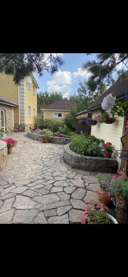 - На участке есть 4 больших, высоких клумбы + фонтан с небольшим водоемом, примерно на два с половиной куба в котором живут рыбы и черепахи, растёт бамбук и лилии - все это уложено красивым природным камнем, дорожки тоже из природного камня. Беседка сделана из ажурной металлоконструкции и прилегает к дому (место для отдыха) тоже стоит на заливном фундаменте, внутри пол выложен декоративным бехотонам. На участке в зоне отдыха залита площадка под большой бассейн 8*8 м. так же установлена большая скамейка.