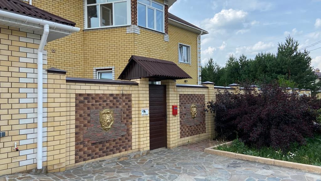 Фасад: забор из крепкого пескоблока и кирпича на капитальном заливном глубоком, основательном фундаменте. Лицевая часть забора отделана декоративным камнем и барельефами. Территория перед домом полностью благоустроена, вымощена природным камнем, на заливной, армированной основе, сделан палисадник и клумба, которые отделены прочным бордюром. С права разработан небольшой, огороженный участок для посадки картофеля, которого хватает на всю зиму.