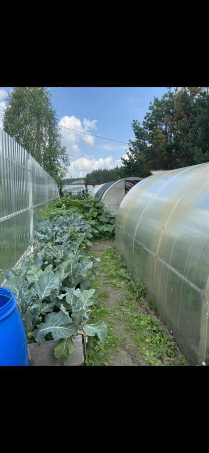 В огороде, как и в саду везде привозная плодородная черная удобренная земля, сделано много огороженных высоких чистых грядок, дорожки просыпаны желтым песком, имеется две теплицы и три парника, так же для полива работает летний водопровод и накопительный бак для теплой воды и принятия душа.