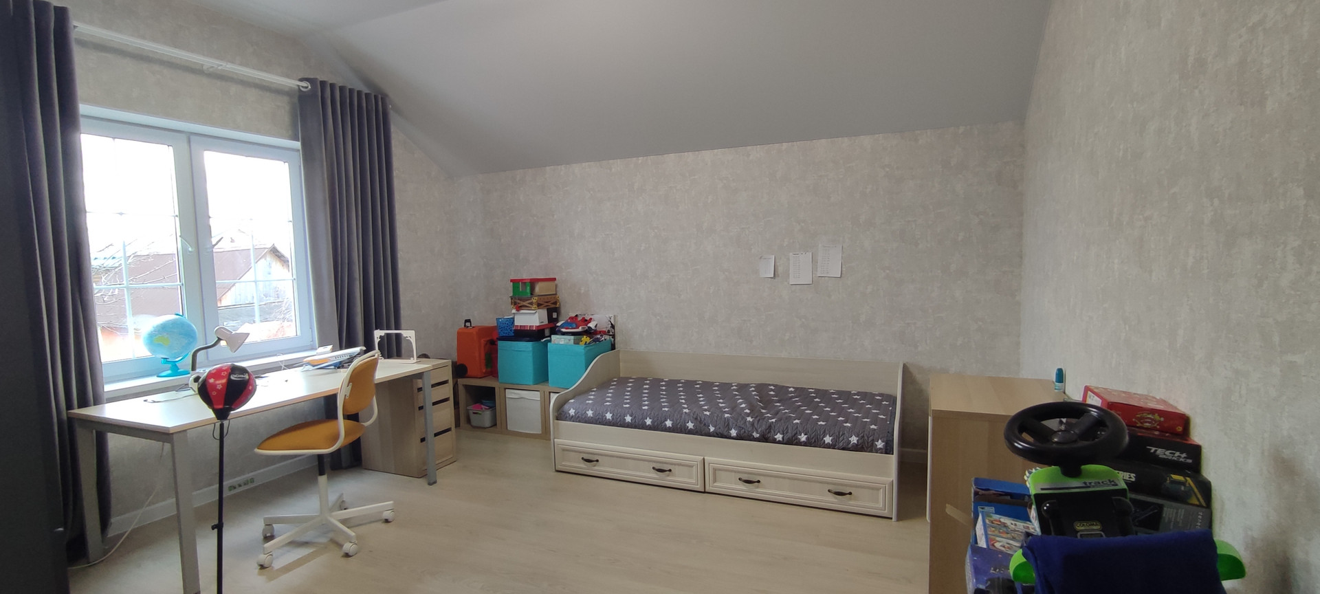 В доме 12 помещение из них 5 жилых комнат:  4 спальни, гостиная с кухонной зоной, 2 санузла, терраса, котельная - бойлерная и тамбур-прихожая. Тамбур теплый. Ванная на 1-м и на 2-м этажах.