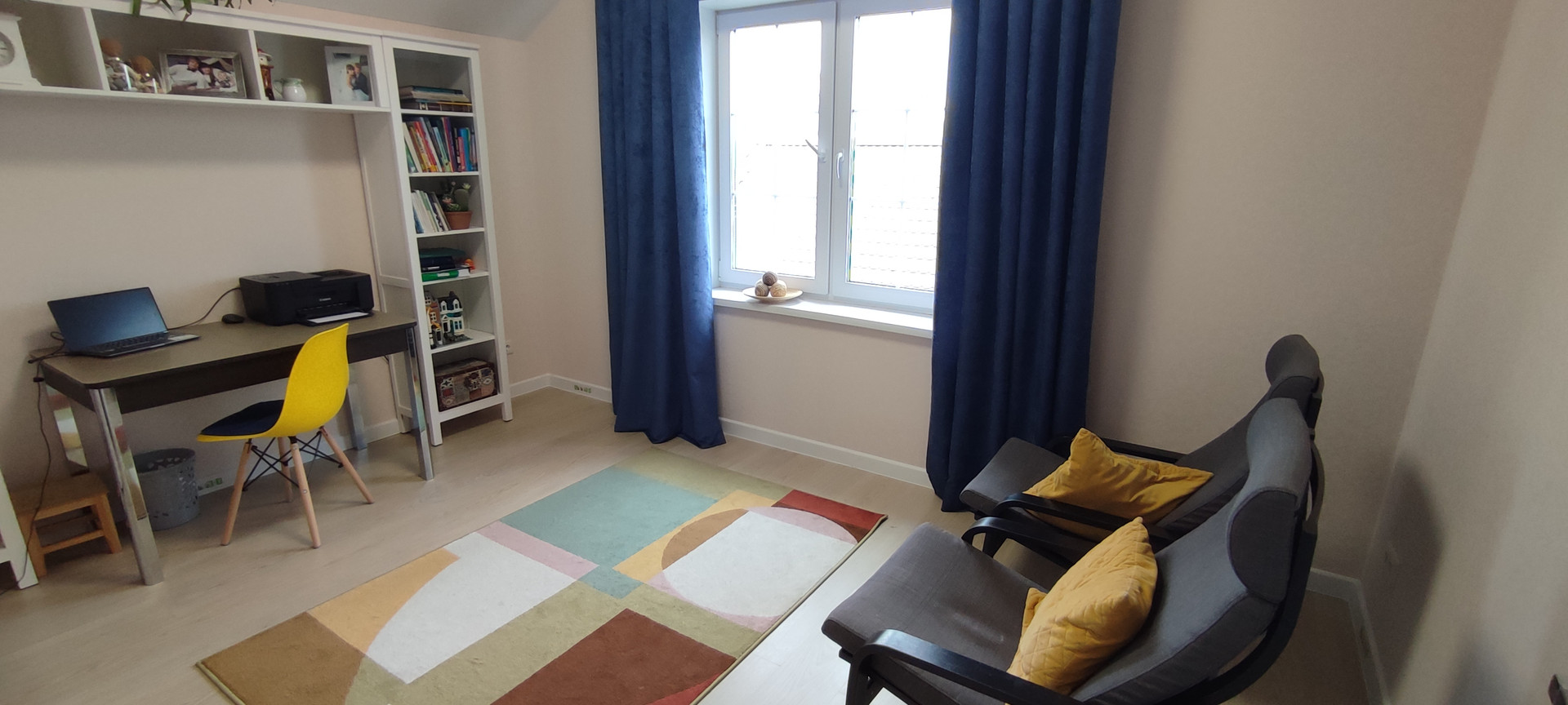 Двух пролетный лестничный марш позволил осуществить пологий подъём и спуск со второго этажа, с которым легко справиться как малолетние дети, так и люди преклонного возраста. Просто огромна гостиная комната 39 кв. м. имеет выход во двор на террасу 25,5 кв м.