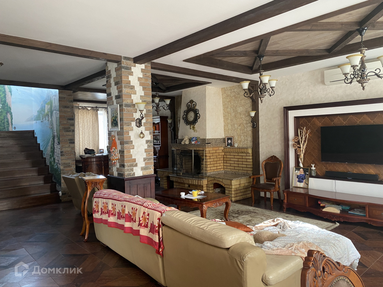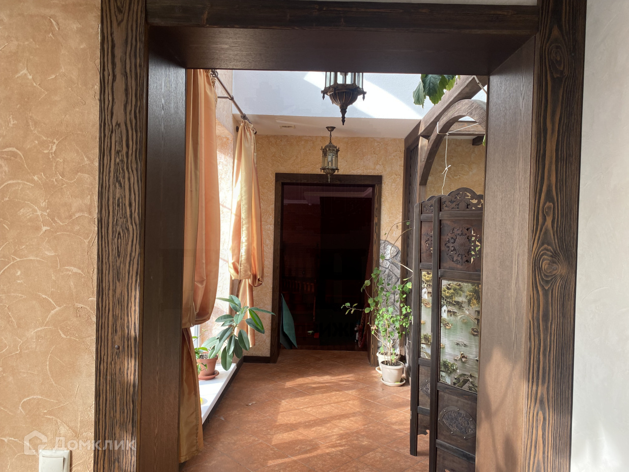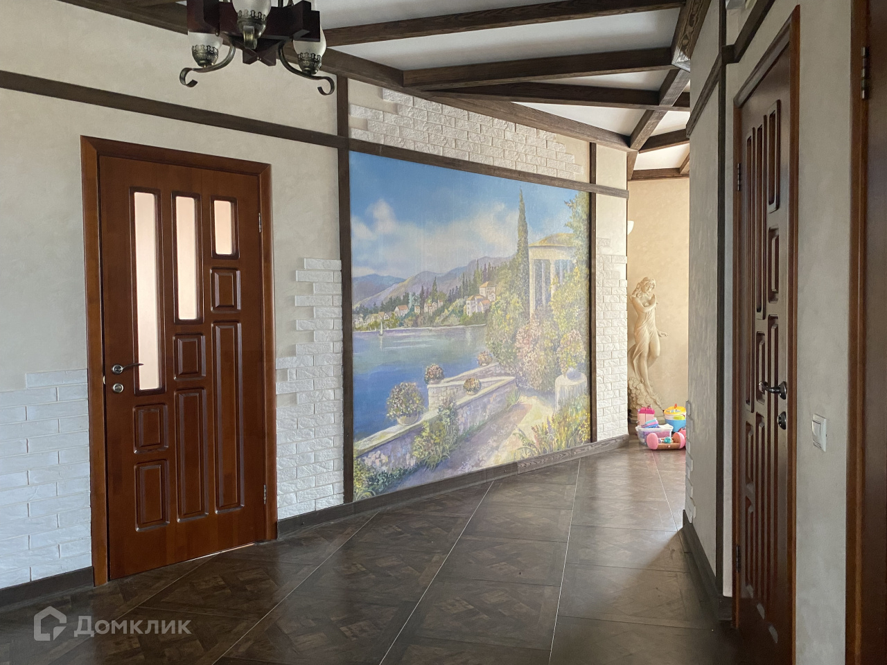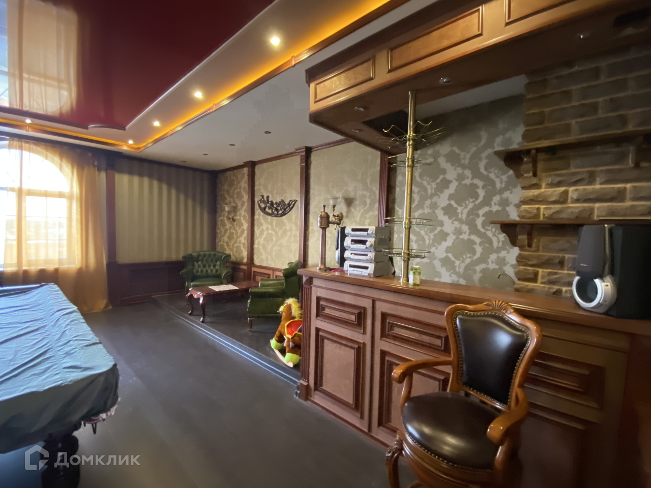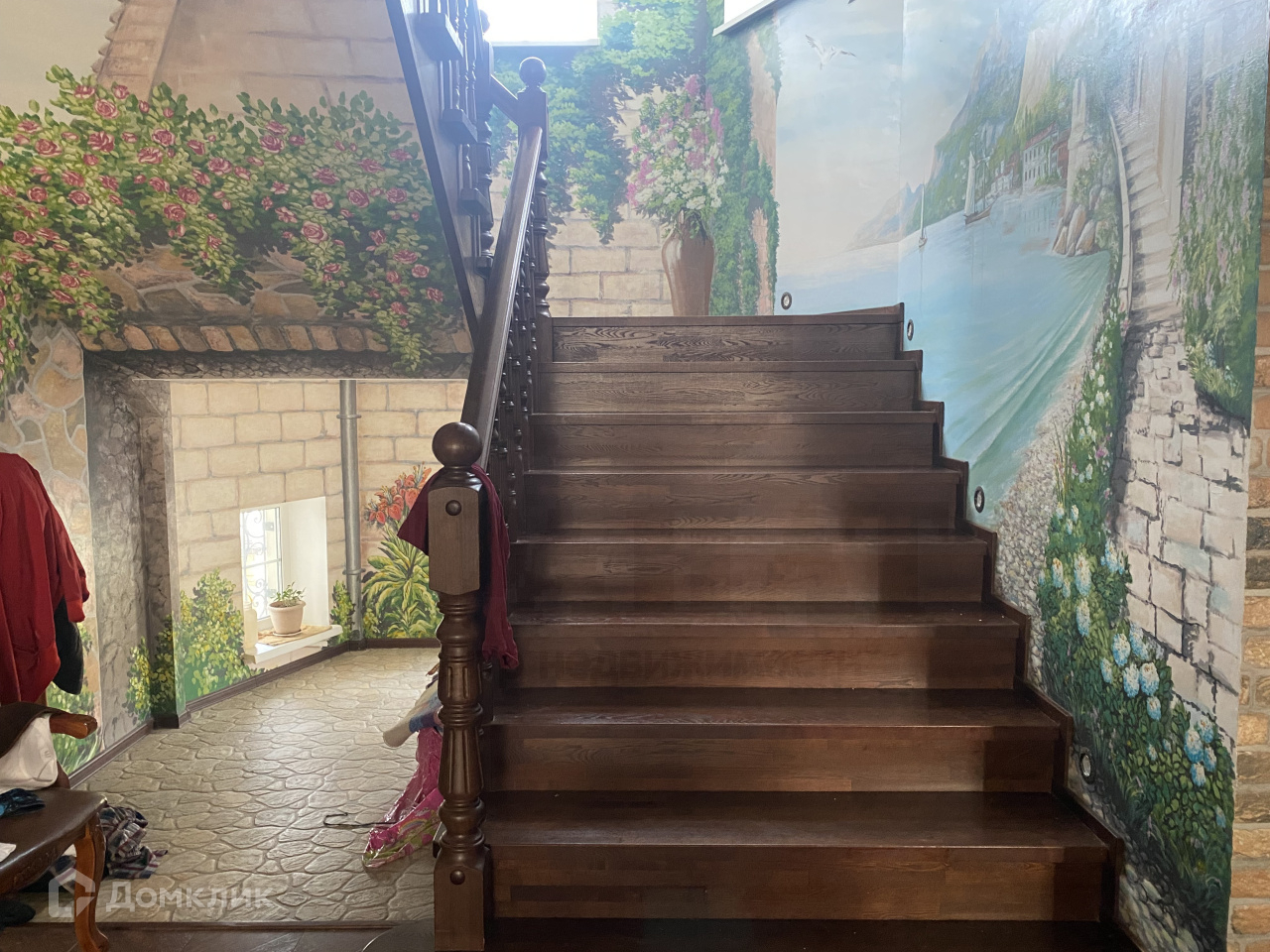 В доме - просторная гостинная с камином 60 кв.м., кухня -12 кв.м., холл, гостевой туалет. На втором этаже (ведет широкая лестница) спальня 32 кв.м., из нее детская комната. Напротив вторая детская 12 кв.м., рядом просторная ванная комната с джакузи, по коридору - зимний сад с фантаном , спорт.зал, бильярдная, на третьем этаже мастер спальня с ванной комнатой, и гардеробной. Вторая спальня для гостей . Второй третий этаж-кабинет, с потайными комнатами для хранения вещей. Использованы дорогие материалы, стены расписаны художником, мебель привязана из Китая по подбору дизайнера.