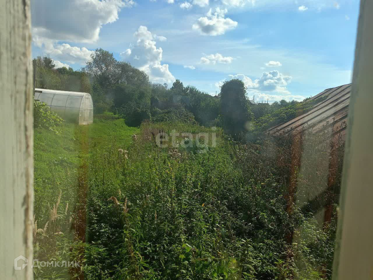 Большой огород с яблоневым садом, есть другие плодовые растения (слива, вишня, крыжовник), участок разделяет овражек, есть небольшой ручеёк (можно сделать прудик с естественным наполнением), дальше на участке есть небольшая беседка.