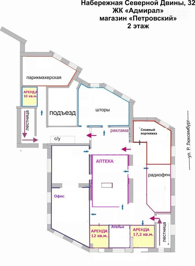 На 1м этаже - магазин "Петровский",  на 2-м этаже - парикмахерская, салон штор, ателье, офис GrееnWаy.