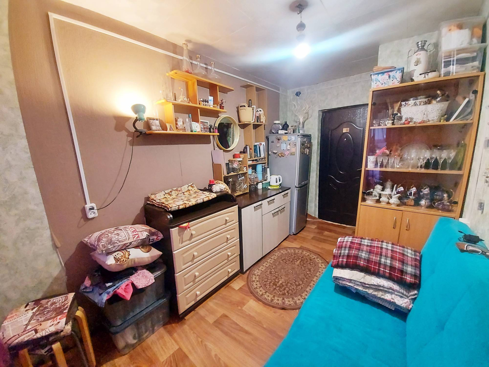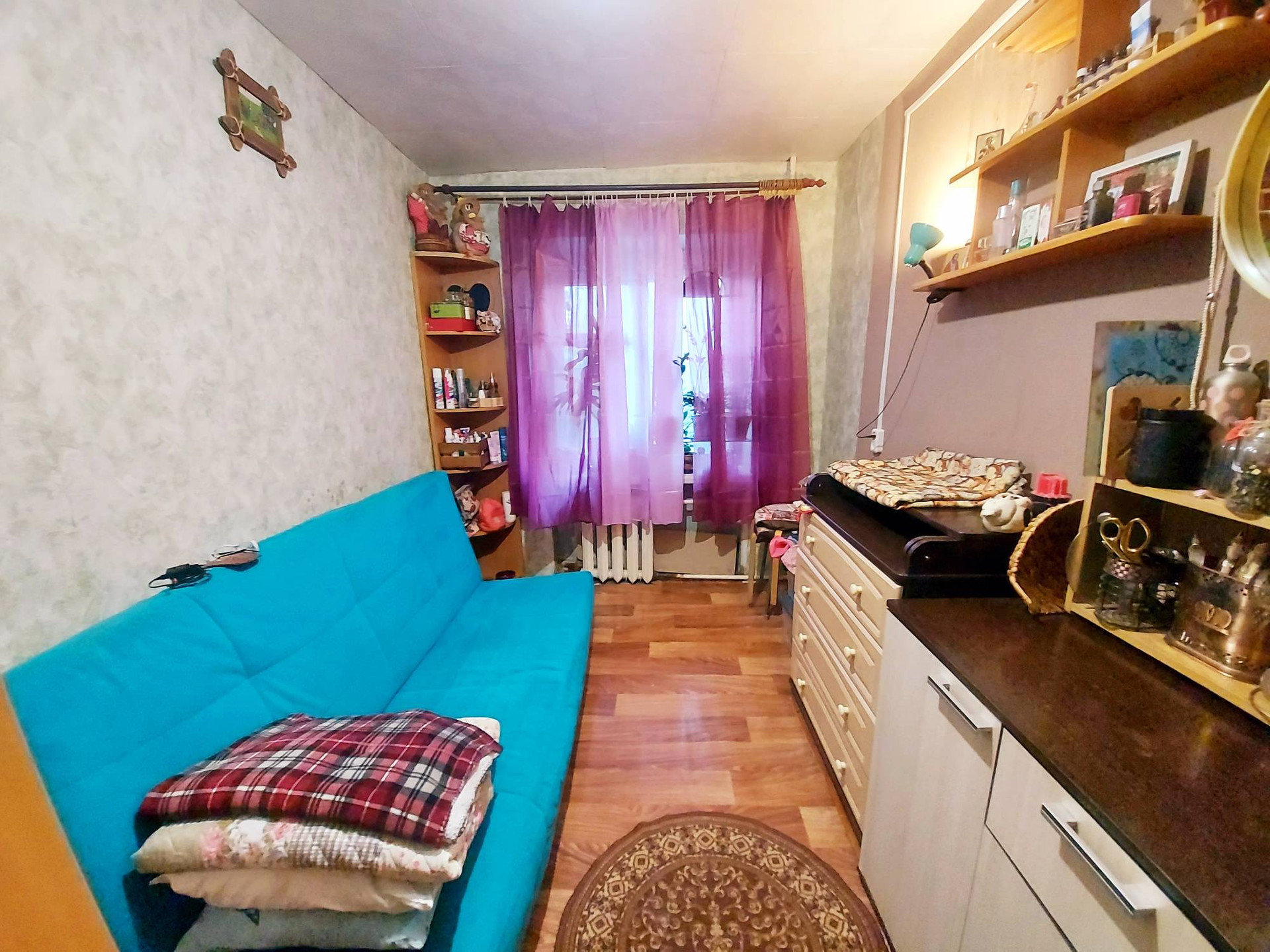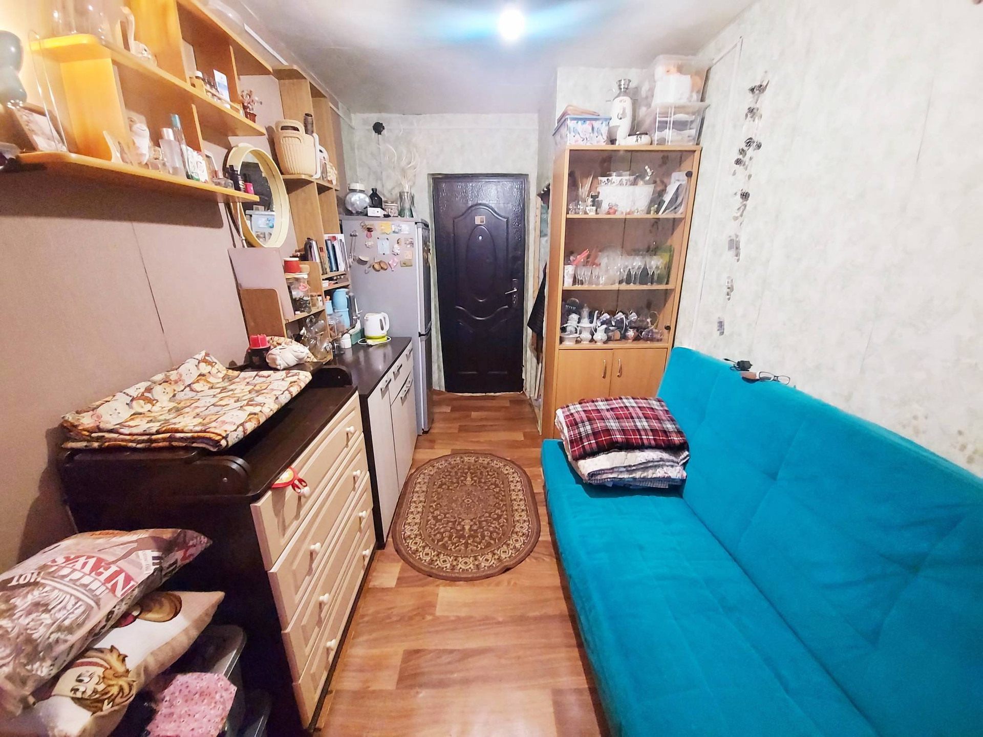 Окна комнаты выходят во двор. Не угловая. Выделено место на общей кухне. Кухня и санузел (раздельный) на 5 комнат. Спокойные соседи.