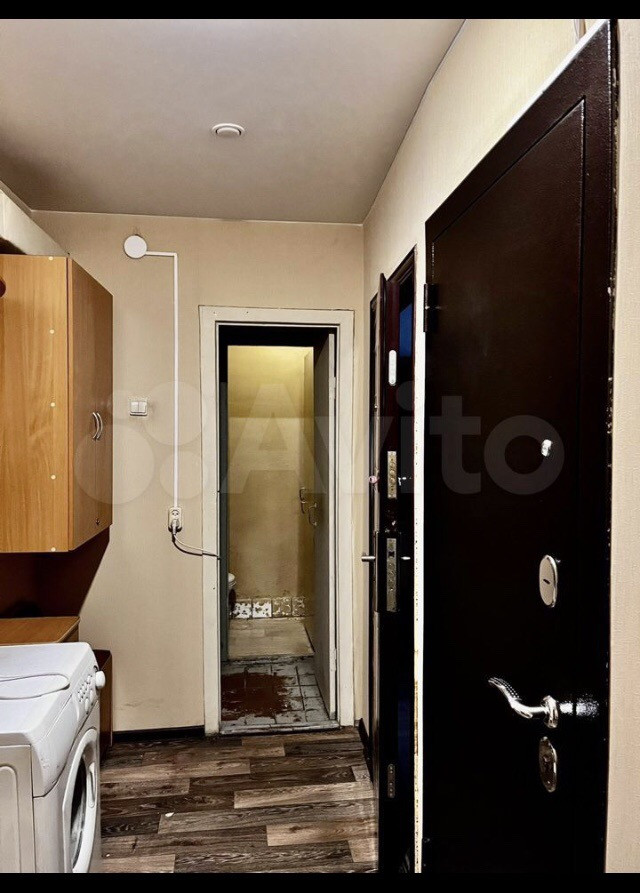 Большой коридор между комнатами. Остается частично мебель, стиральная машина.