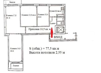Продается 4-комнатная квартира, расположенная на 9 этаже 9-этажного панельного дома 1974 года постройки. * Квартира общей площадью 77,5 кв. м . * Комнаты раздельные площадью: 10,4; 13,8; 14,6; 17,8 кв. м. * Площадь кухни 6,6 кв. м. * Санузел раздельный. * Прихожая площадью 10,5 кв. м. * Балкон и лоджия застеклены. * Одним из огромных плюсов в приобретени... |