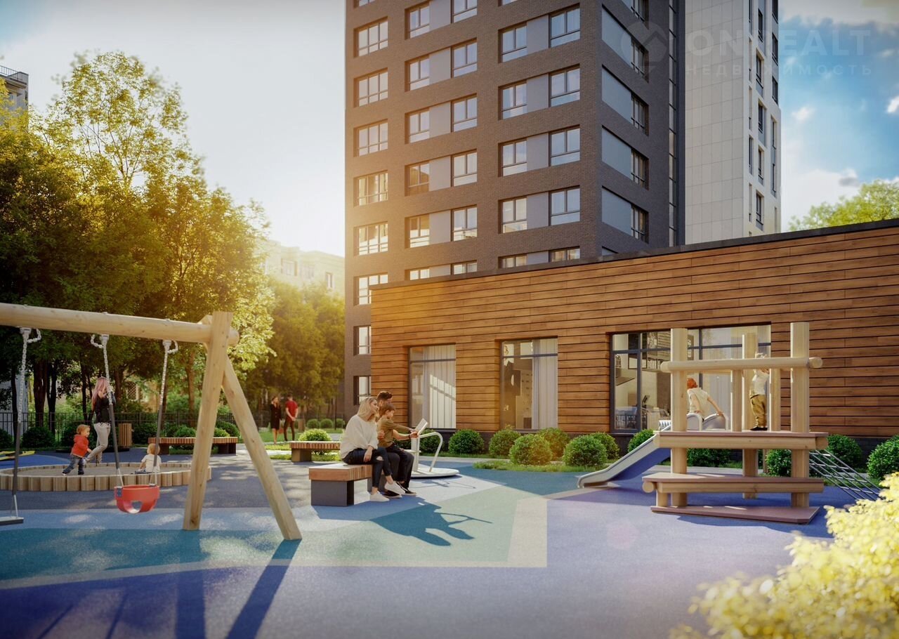 Благоустройство двора: разновозрастные детские площадки с антитравматическим покрытием, турники, велопарковки, зоны отдыха со скамейками, озеленение территории.