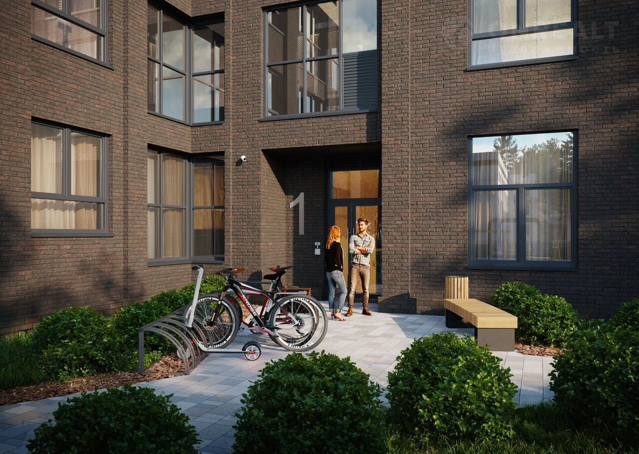 Благоустройство двора: разновозрастные детские площадки с антитравматическим покрытием, турники, велопарковки, зоны отдыха со скамейками, озеленение территории.