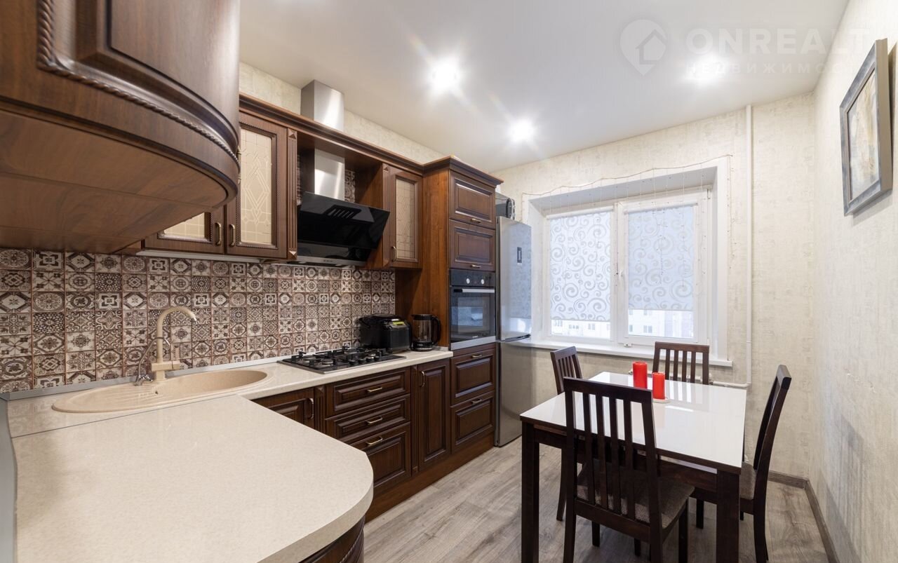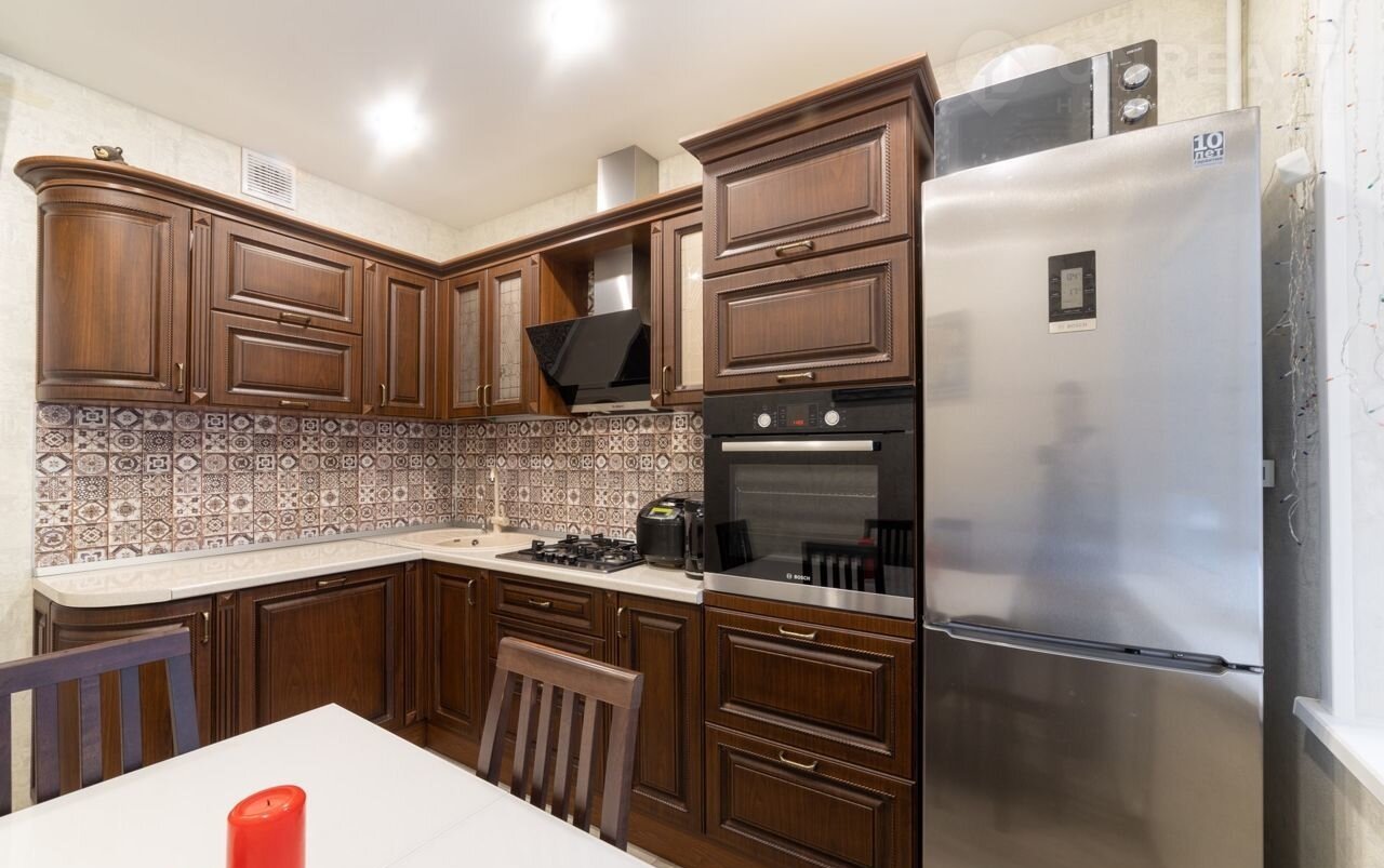 Остаётся встроенная кухня с техникой Воsh ( посудомоечная машина, вытяжка, духовой шкаф).