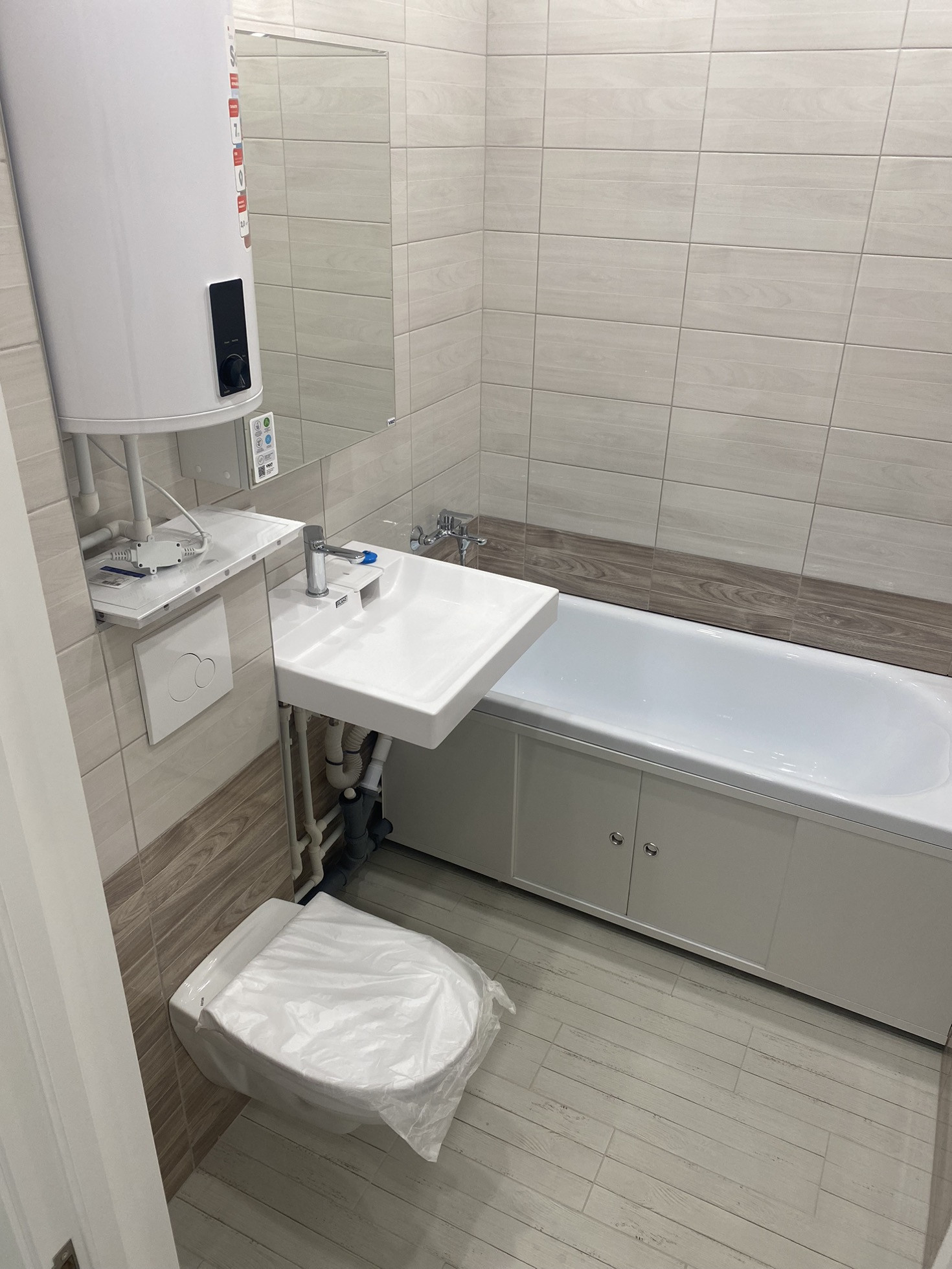 -с/у совмещен,новая сантехника, трубы, установлены новые счетчики на воду, новая ванна, раковина , инсталляция, водонагреватель,также сделаны выводы под стиральную машину .