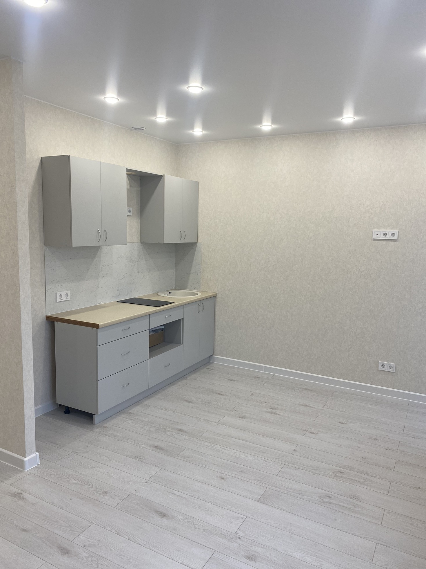 -потолки везде натяжные, со встроенными лампочками.
