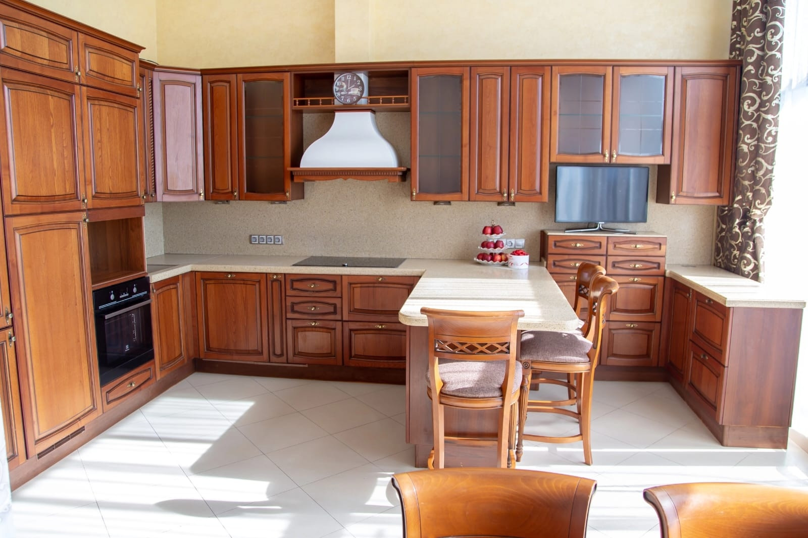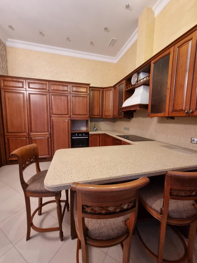 Кухня-гостиная 23 кв.м. укомплектована гарнитуром "Верона", встроены два холодильника, морозильная камера, посудомоечная машина; шкафы имеют современные выдвигающиеся и вращающиеся полочки для посуды и продуктов.