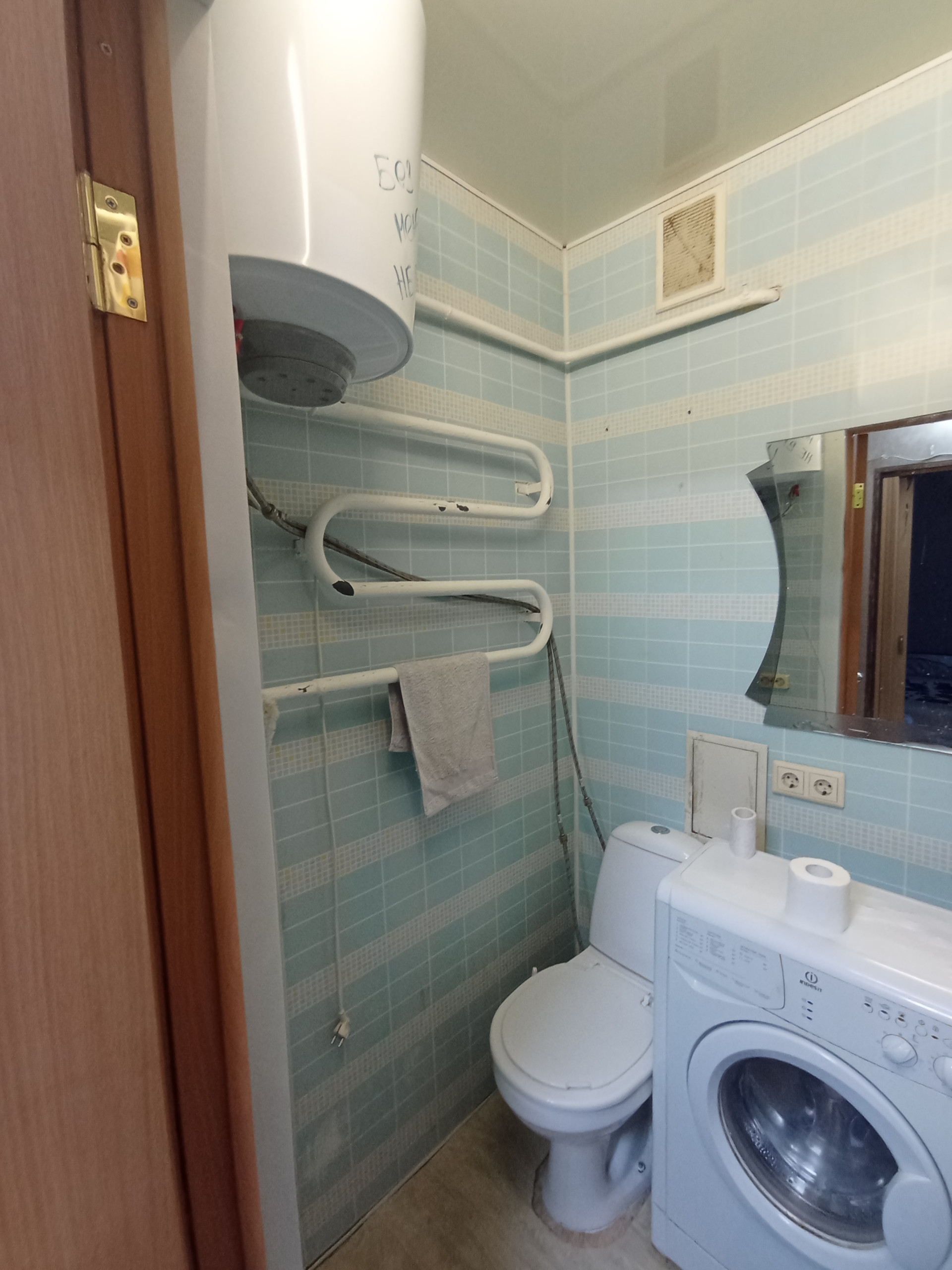 Санузел совмещён, стены обшиты пластиковыми панелями, пол- кафель, установлен водонагреватель. Заменены все системы коммуникаций.