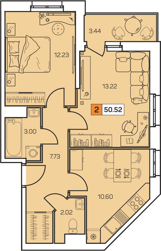 Общая  площадь - 50,25 м²; просторная кухня - 10,6 м², 2 отдельные комнаты по 13,2 и 12,2м², раздельный сан.узел; в коридоре специальная ниша под шкаф, застекленная лоджия.