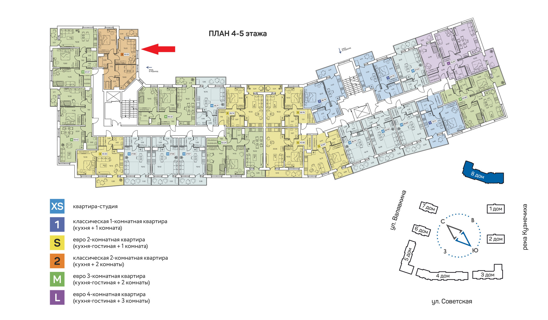 2-комнатная квартира, 50.25 м2, этаж 5 / 8, на продажу в Архангельске, улица Валявкина