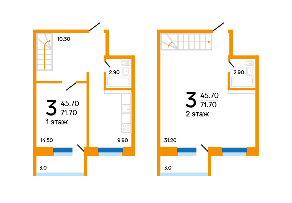 Квартира расположена на двух этажах, общая площадь 71,7 кв.м, жилая площадь 45,7 кв.м, имеет отличную планировку.