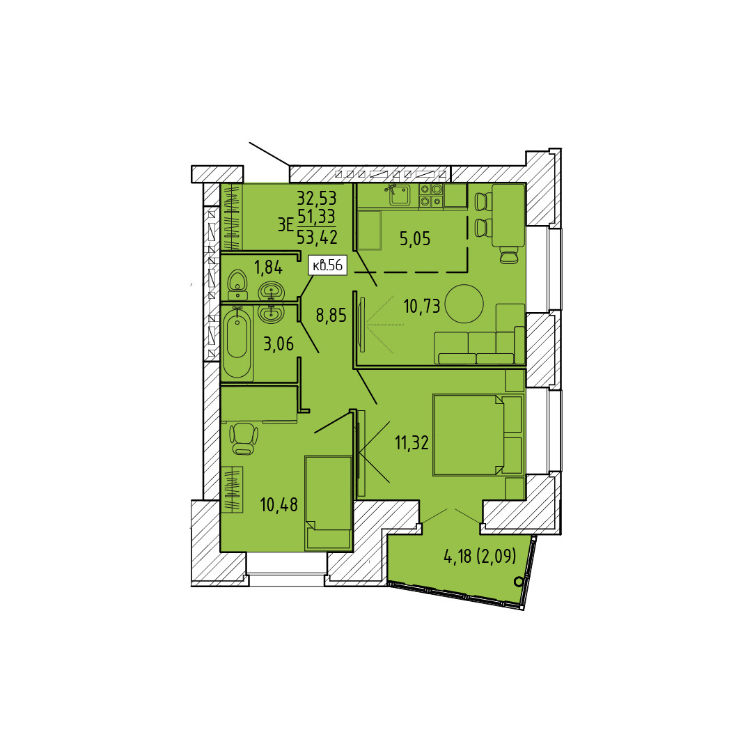 Общая площадь 51.1 м2