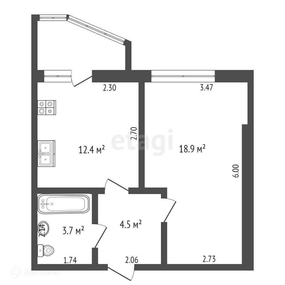 Просторная комната 18,9 м2, большая кухня 12,4 м2, вместительные санузел и коридор.