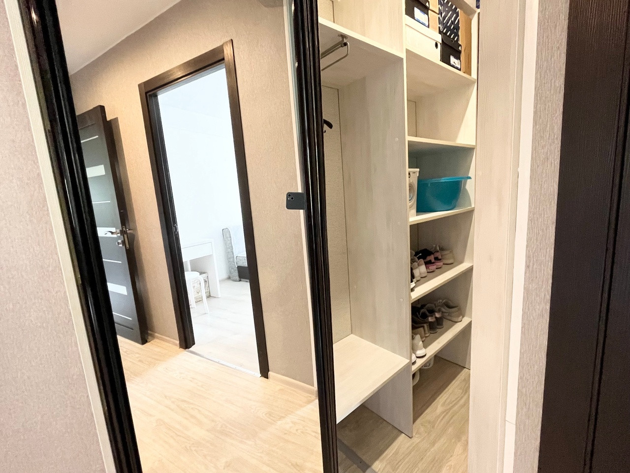 • Общая площадь 42,9 м², 2 отдельные комнаты по 18 и 10 м², раздельный санузел, встроенный просторный шкаф в прихожей.