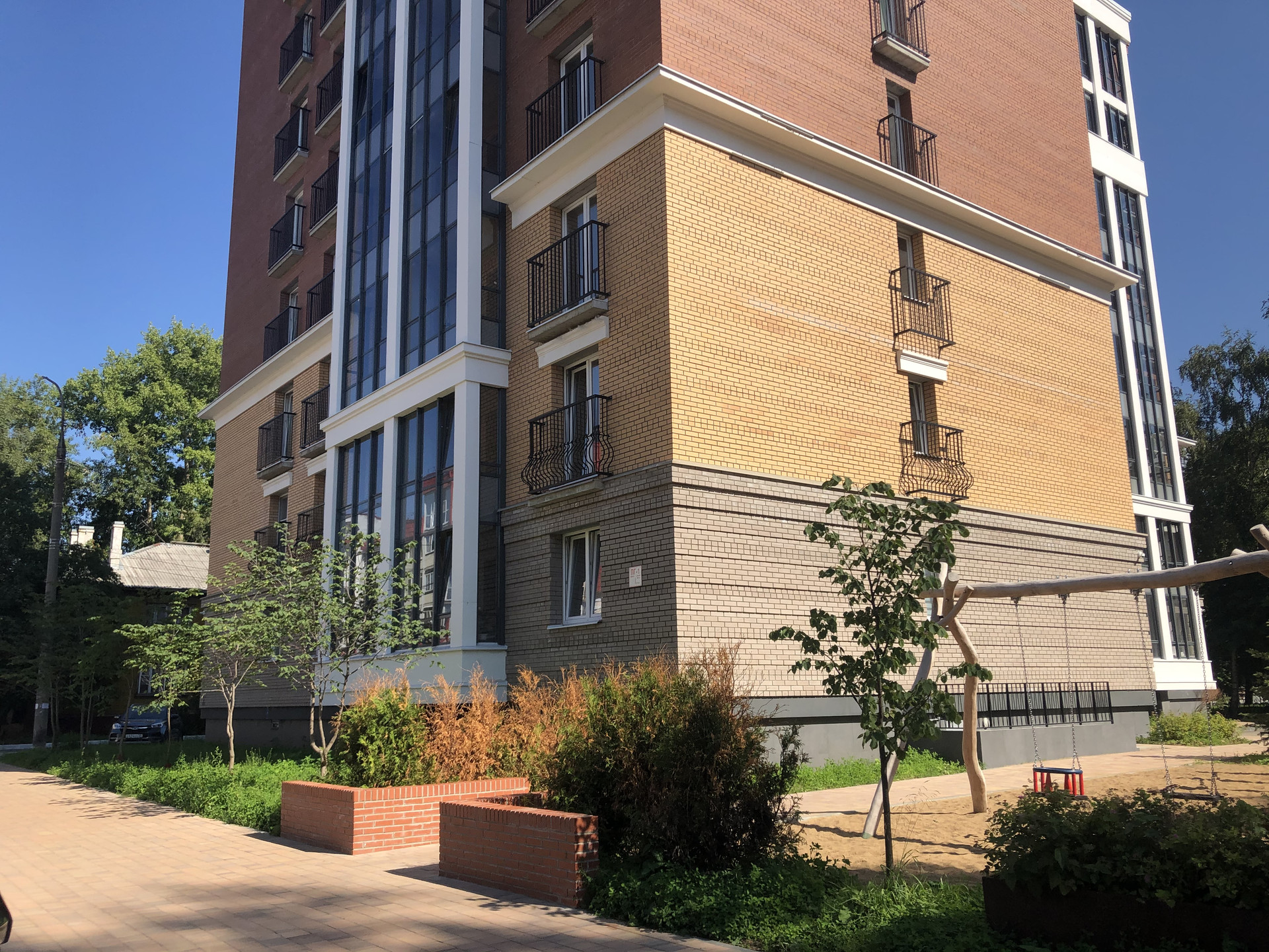 Во дворе дома - есть зарядка для электромобилей и оборудованная детская площадка с благородным озеленением.