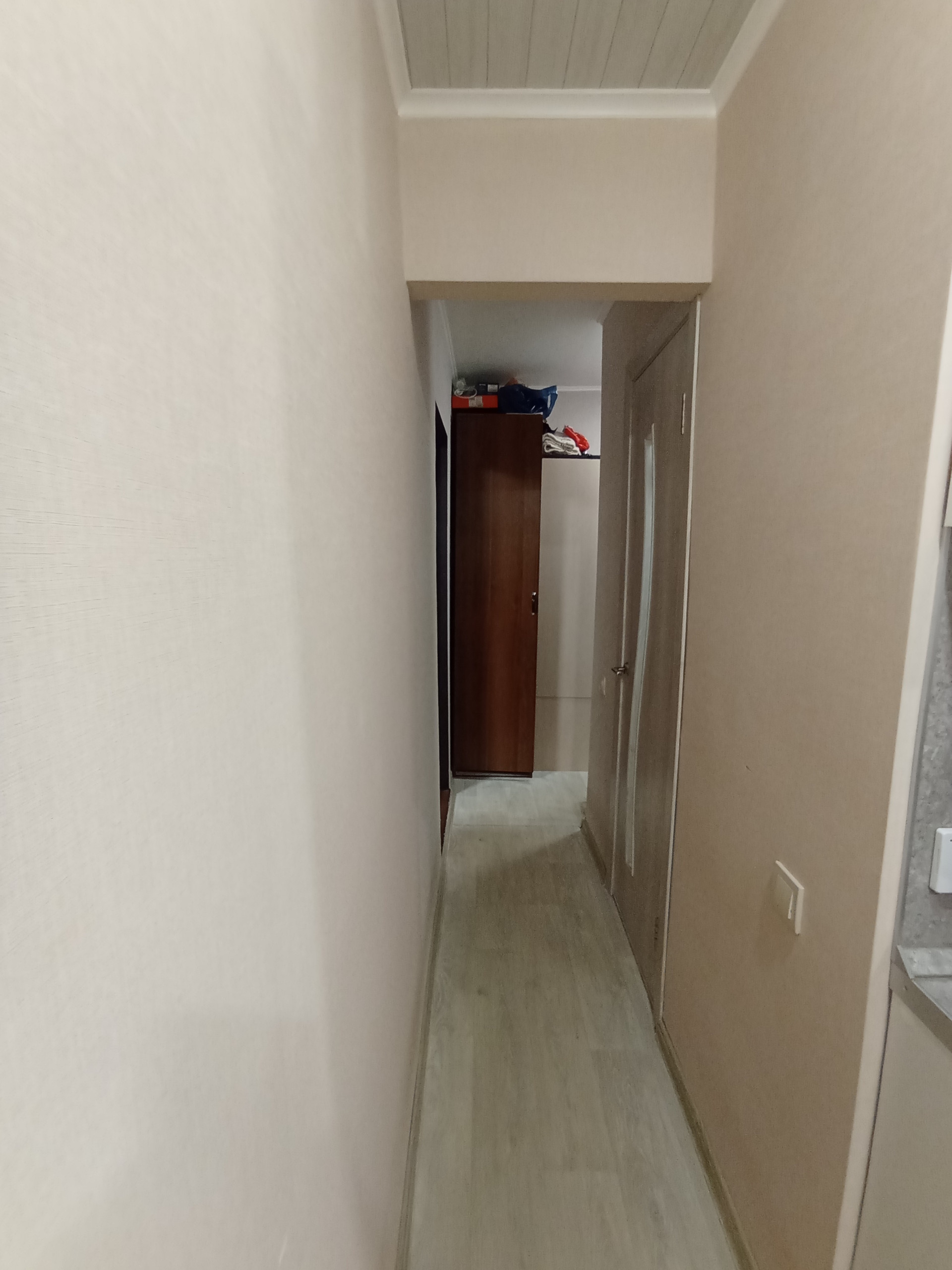 Квартира в отличном состоянии: окна – стеклопакеты (выходят на разные стороны), на полах ламинат, линолеум, кафель. Санузел совмещён, облицован кафельной плиткой, установлены счётчики на воду, водонагреватель на 50 л (трубы и эл. проводка поменяны). В квартире частично остаётся мебель и встроенная кухня с бытовой техникой. Балкон с выходом из комнаты, застеклён (стеклопакет) и обшит.