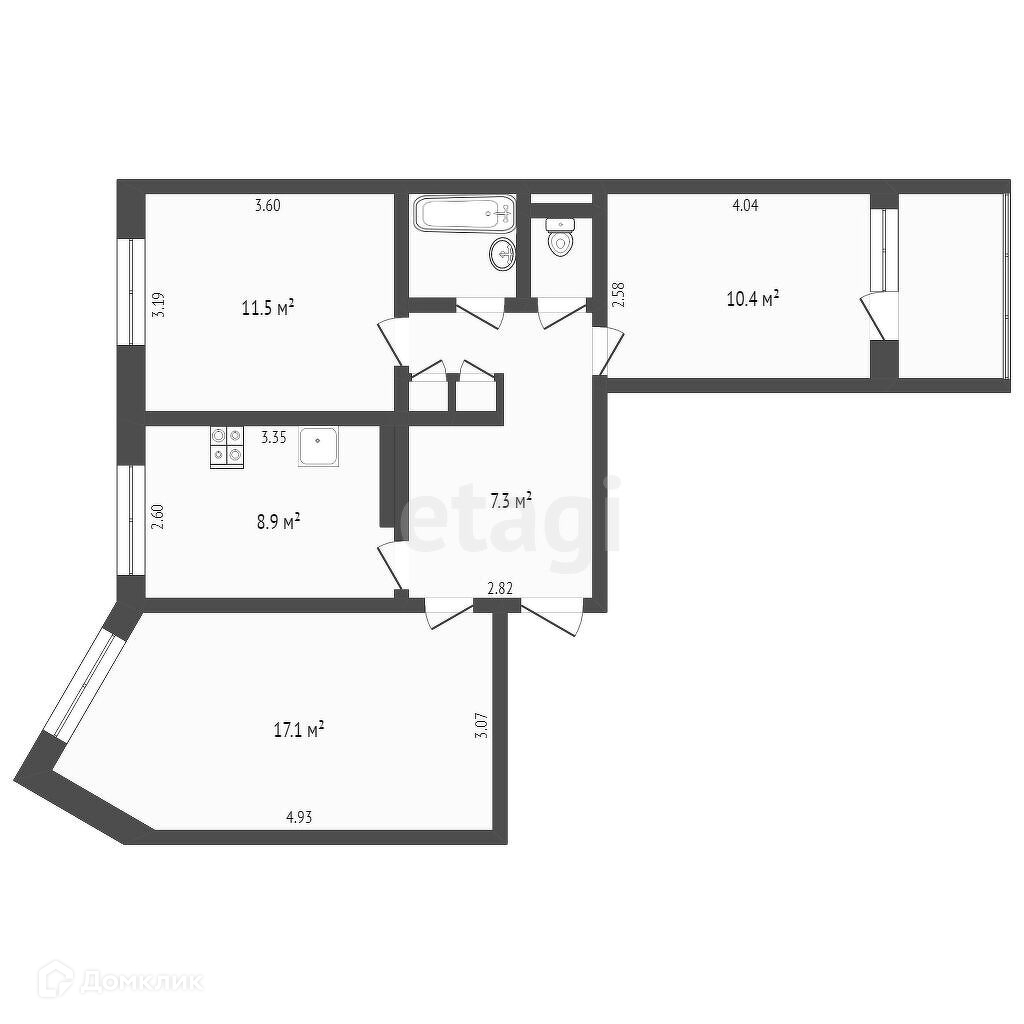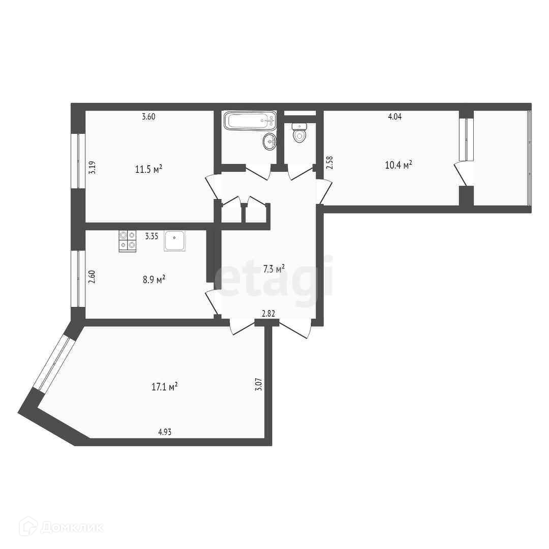 3-комнатная квартира, 62.8 м2, этаж 8 / 9, на продажу в Архангельске, Партизанская улица, 54