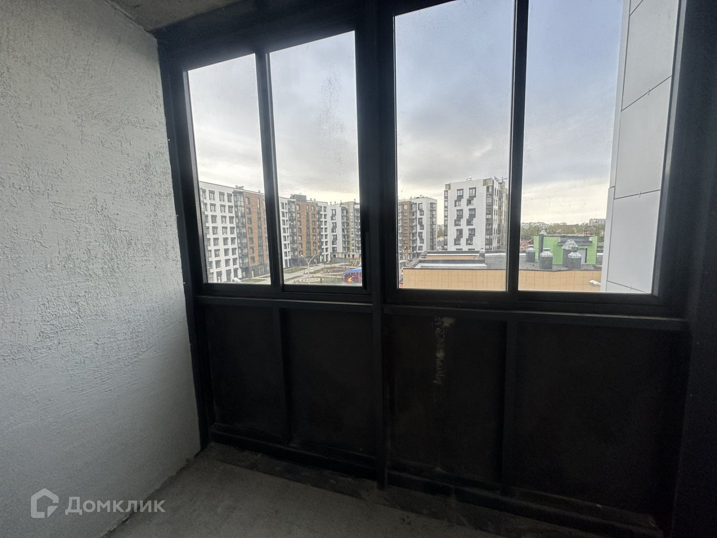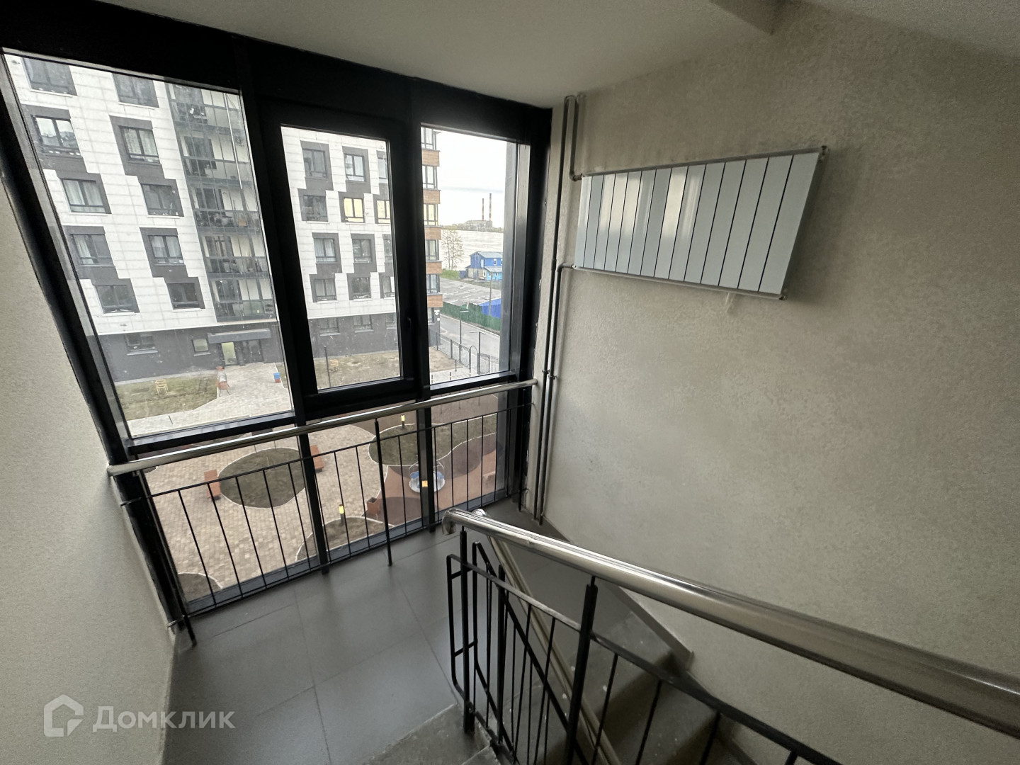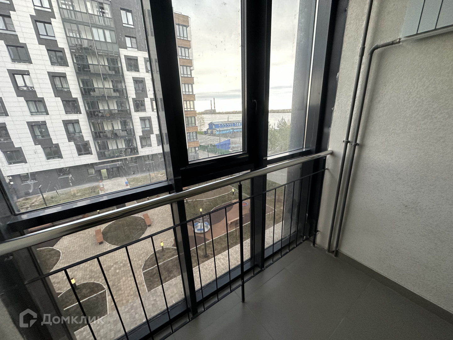 Два окна квартиры с видом на внутренний двор и реку, а с балкона вид на детский сад и территорию жилого комплекса.