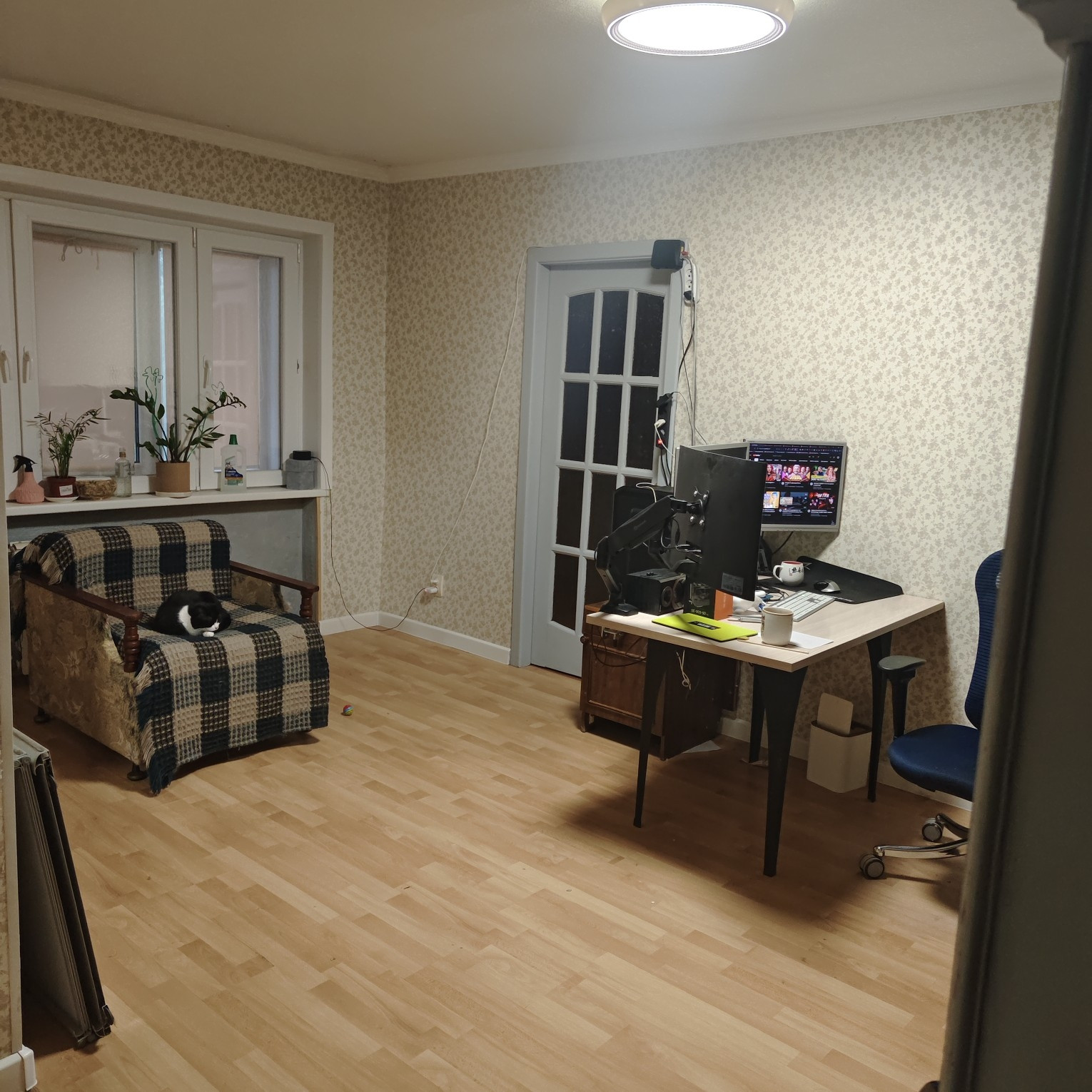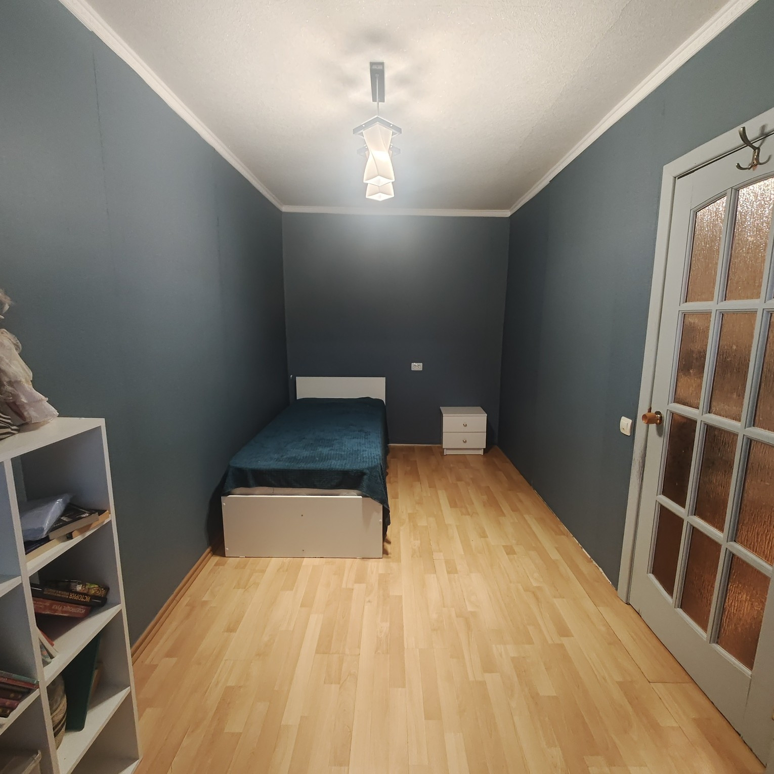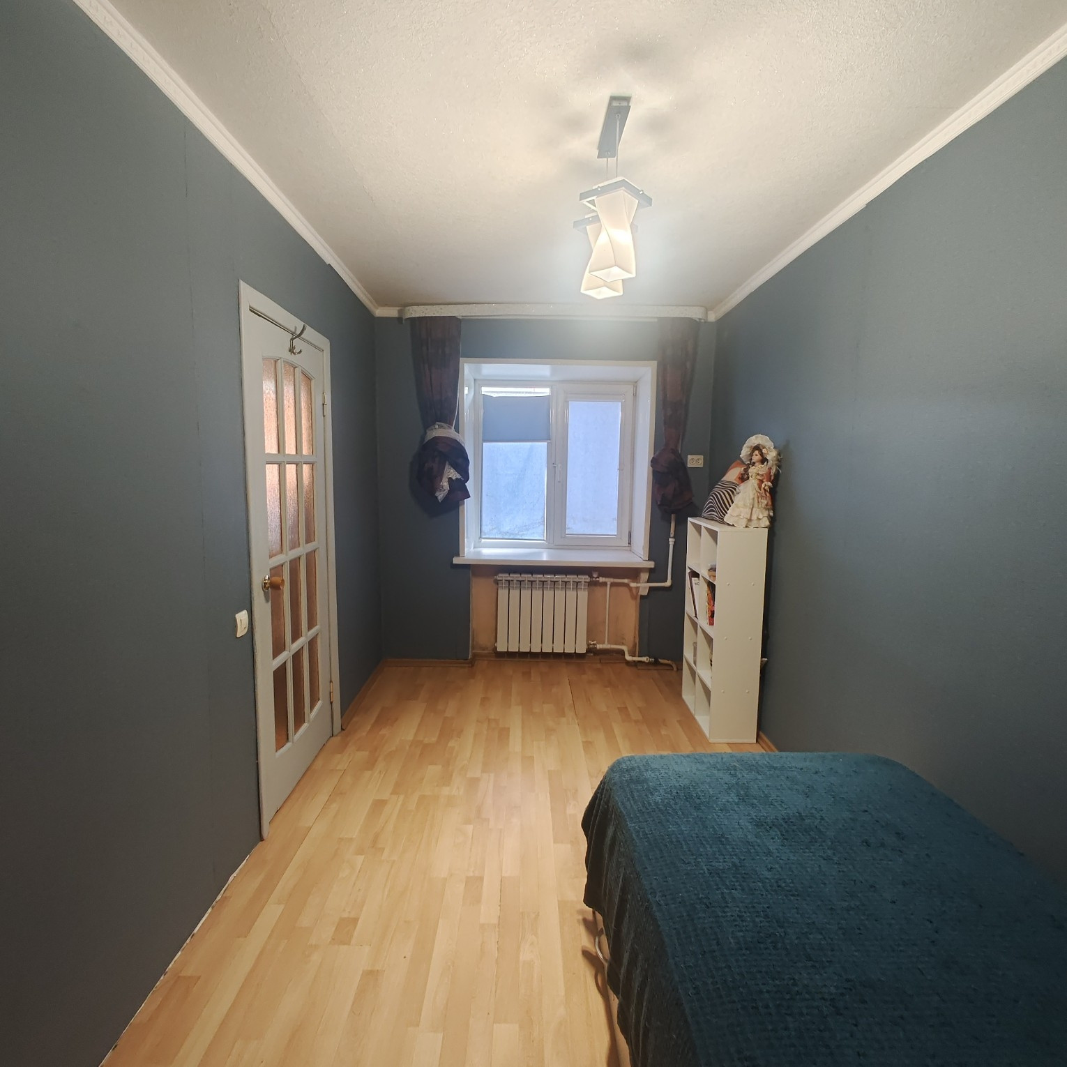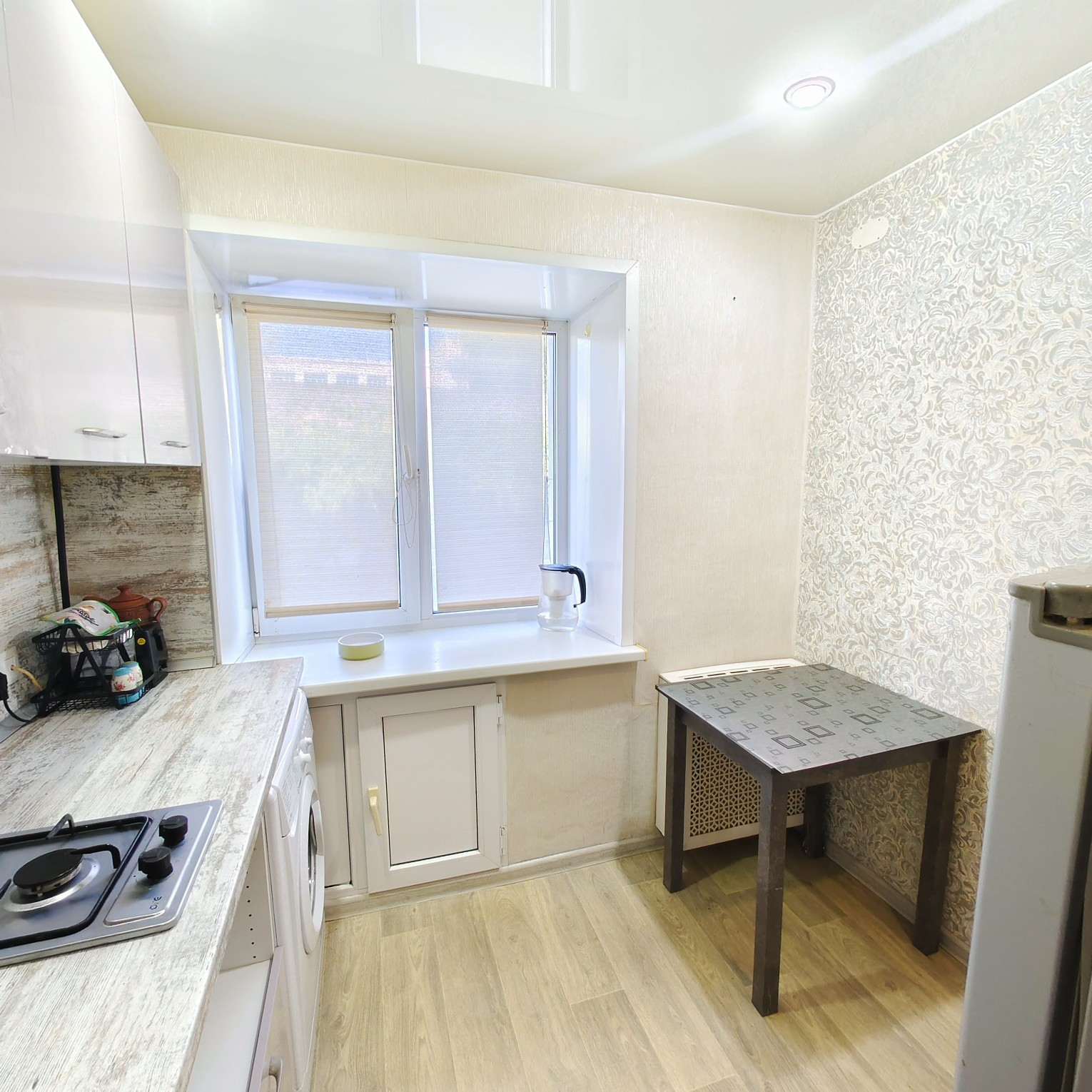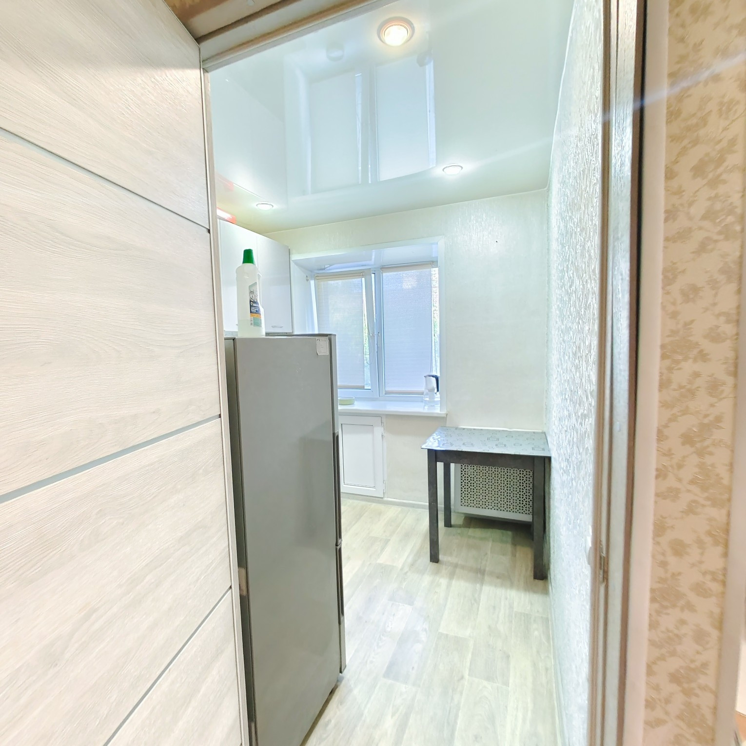 В квартире сделан ремонт, имеется кладовая. На окнах установлены стеклопакеты. Установлены новые радиаторы с регулировкой температуры отопления. На кухне - натяжной потолок, в ванной комнате и в коридоре подвесные потолки. Санузел совмещенный, установлены счетчики горячей и холодной воды. Есть выводы для подключения водонагревателя и установки умывальника. На кухне имеется встроенный-прохладительный шкаф для хранения продуктов, рулонные шторы на окнах. Новым собственникам в квартире остается : кухонный гарнитур,стол, диван.