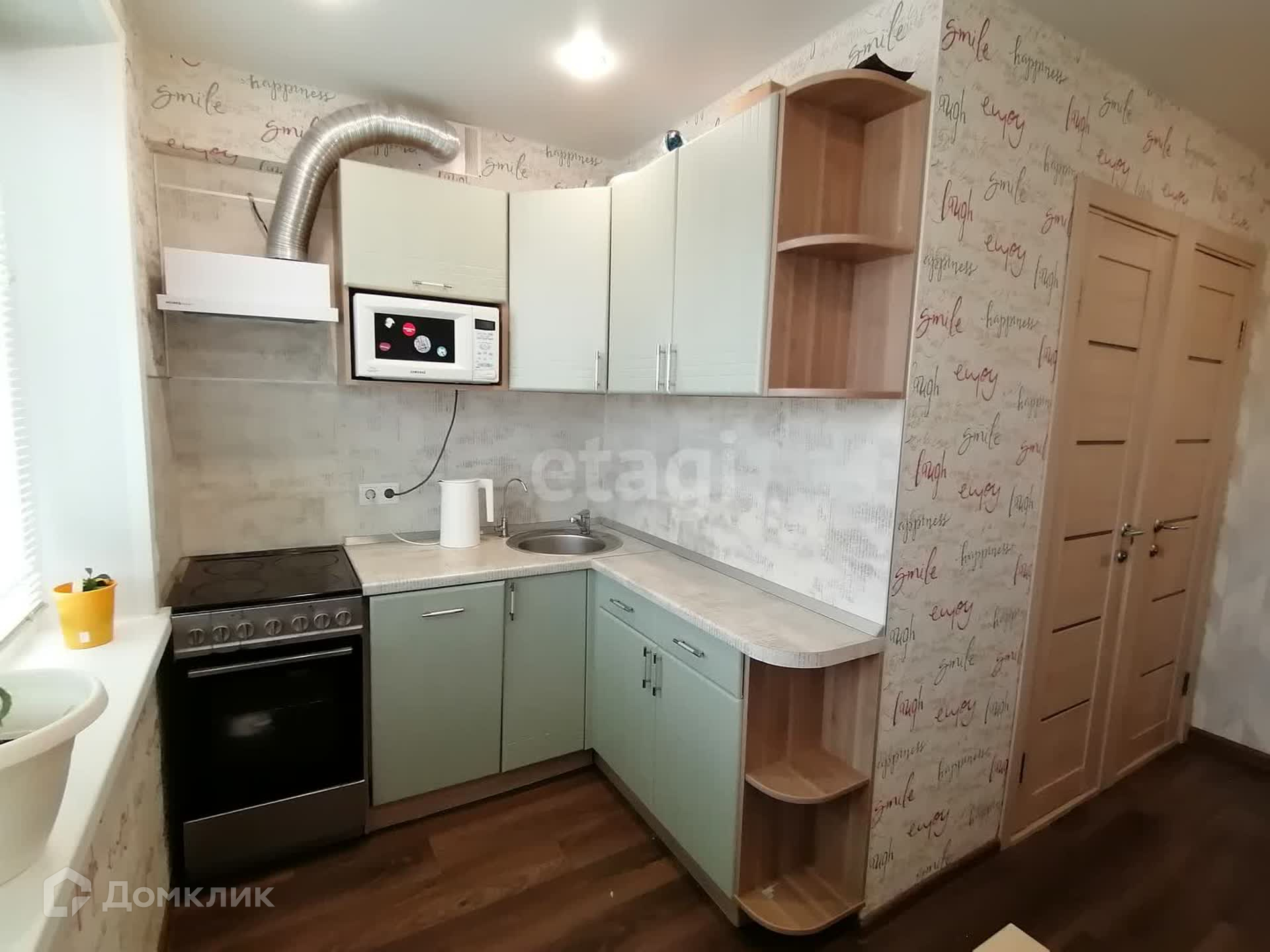 Остаётся кухонный гарнитур с электроплитой и посудомоечной машиной.