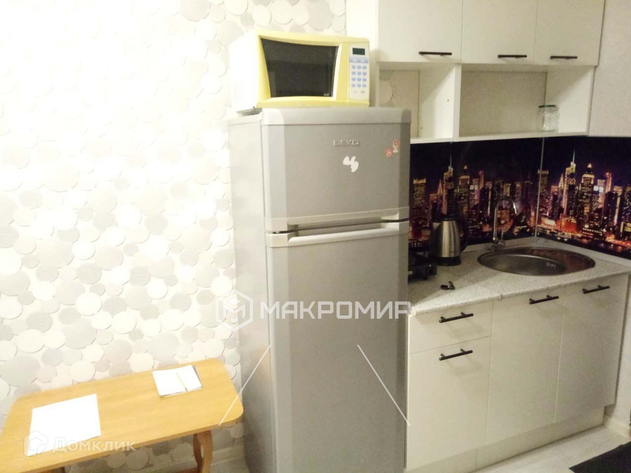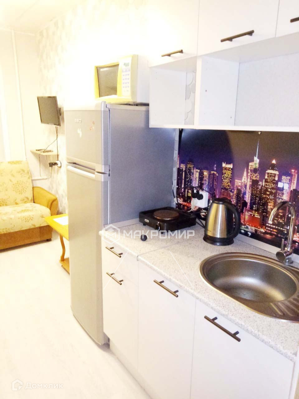 В комнату подведена горячая и холодная вода. Оборудована техникой (телевизор, стиральная машина, холодильник, микроволновка, эл. плита) и мебелью (встроенная кухня, диван, комод, шкаф, стол).