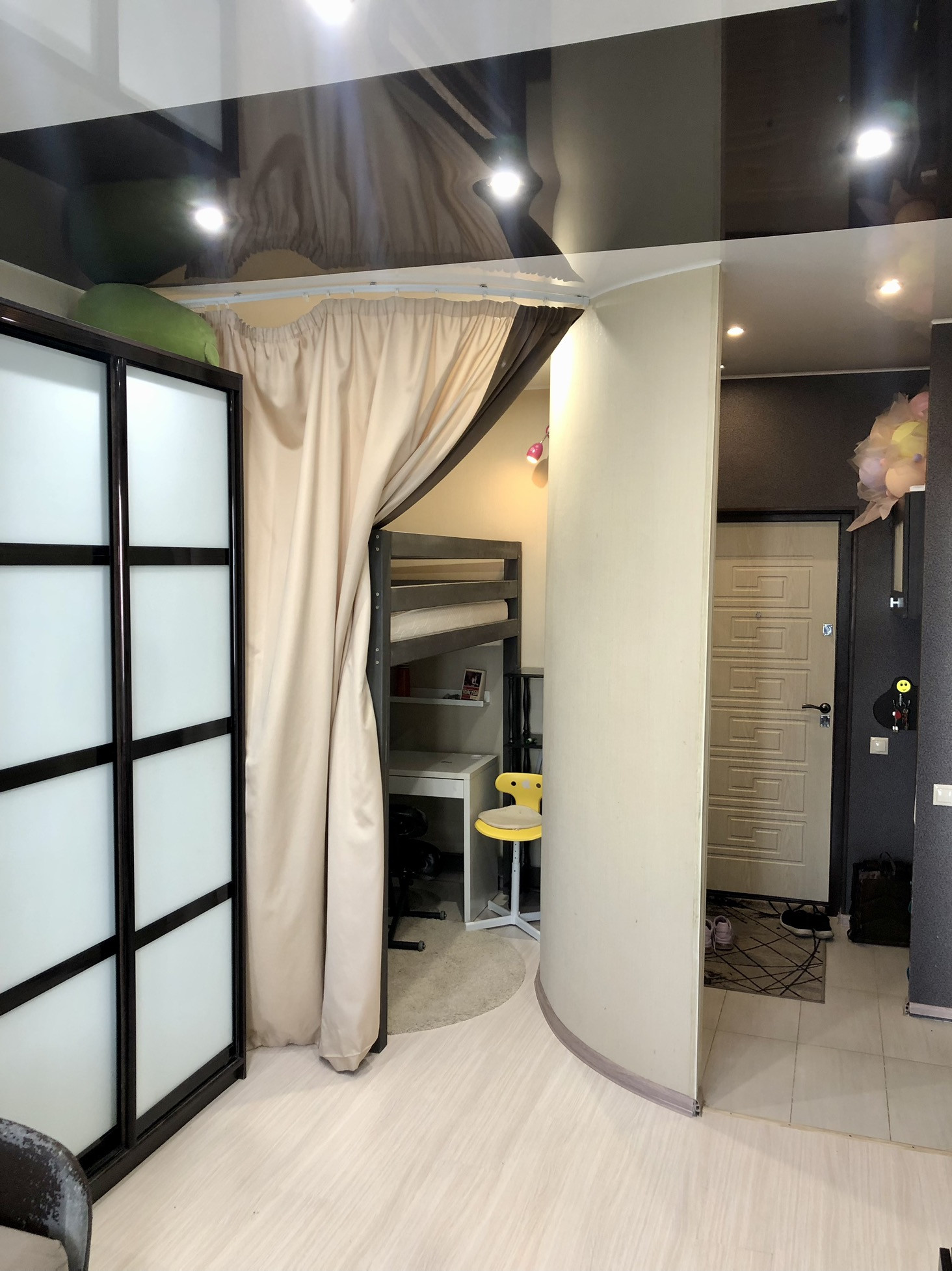 В комнате отделена детская зона два уровня, рабочее место и на втором уровне кровать с ортопедическим матрасом, шкаф купе, стенка горка, диван.