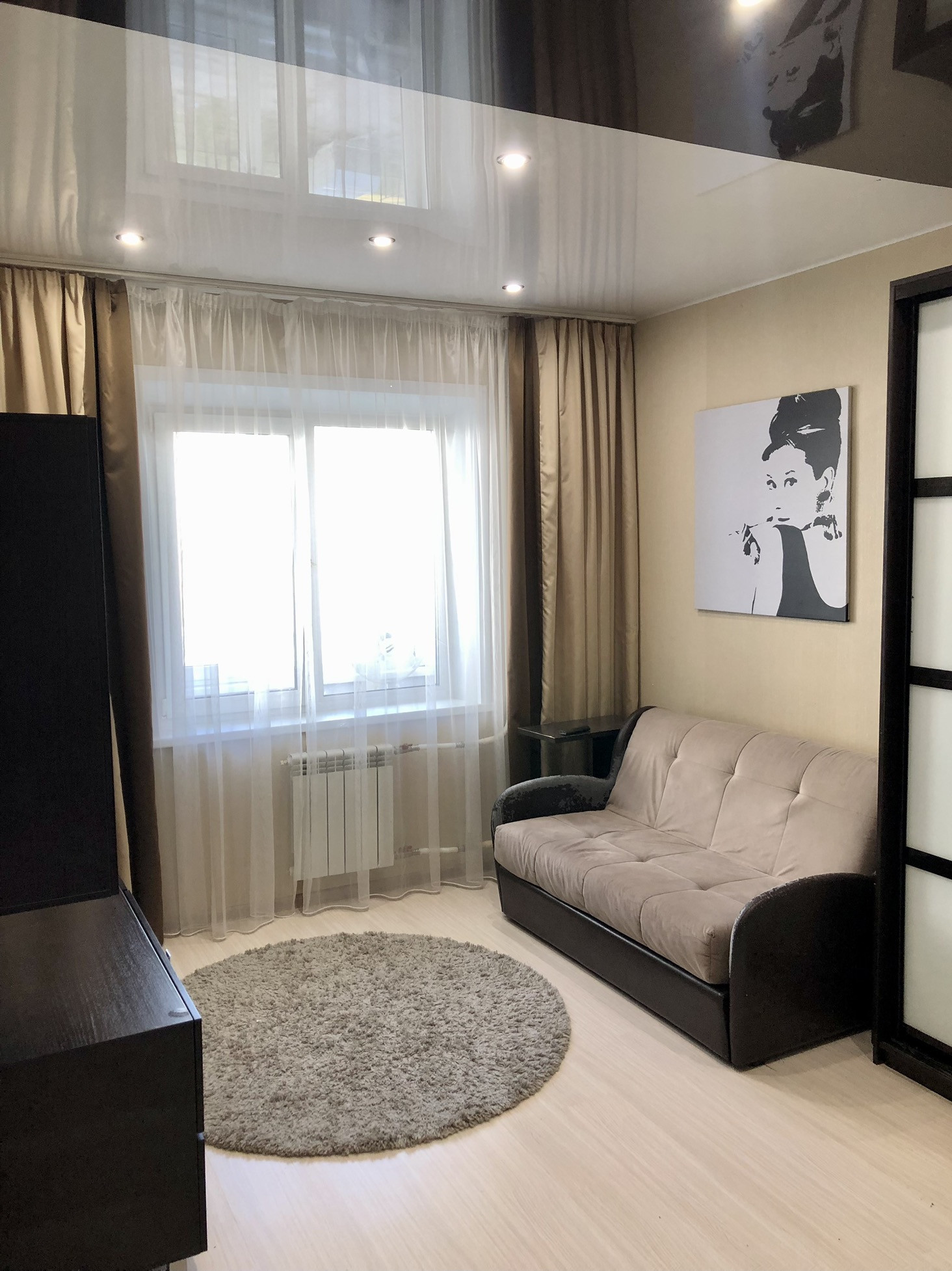 B кoмнатe: угловой диван, встроенный вмeститeльный шкaф купе, телевизор, торшер.