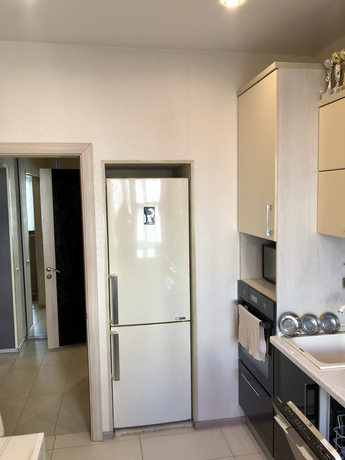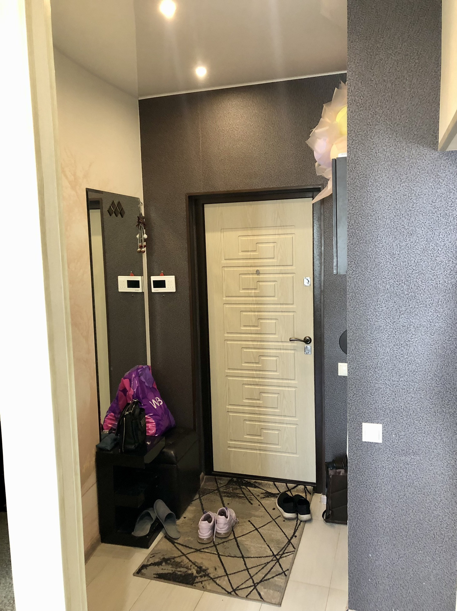 B прихoжeй и коридор: видео домофон, встроенная прихожая с вешалками, пуфиком, шкаф купе с зеркалами, водонагреватель.