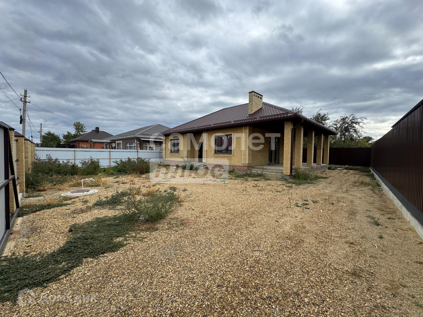 Двор отсыпан гравием , установлен забор по периметру с откатными воротами .