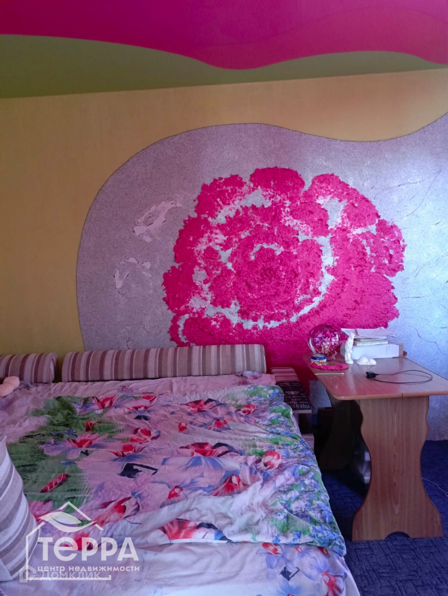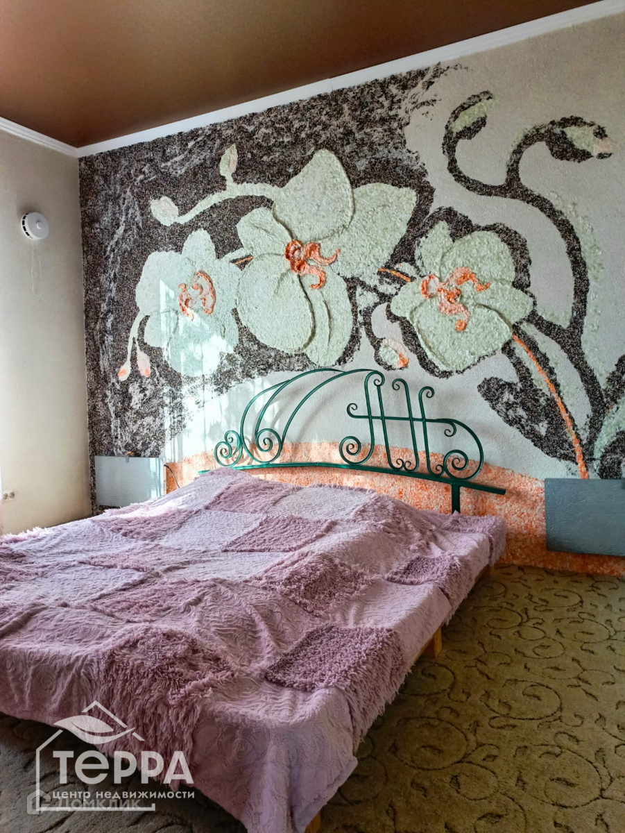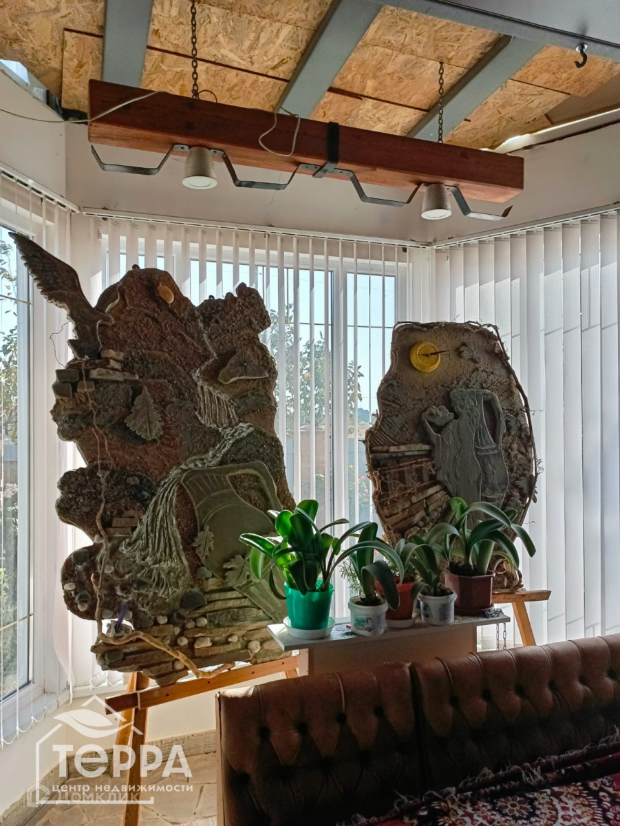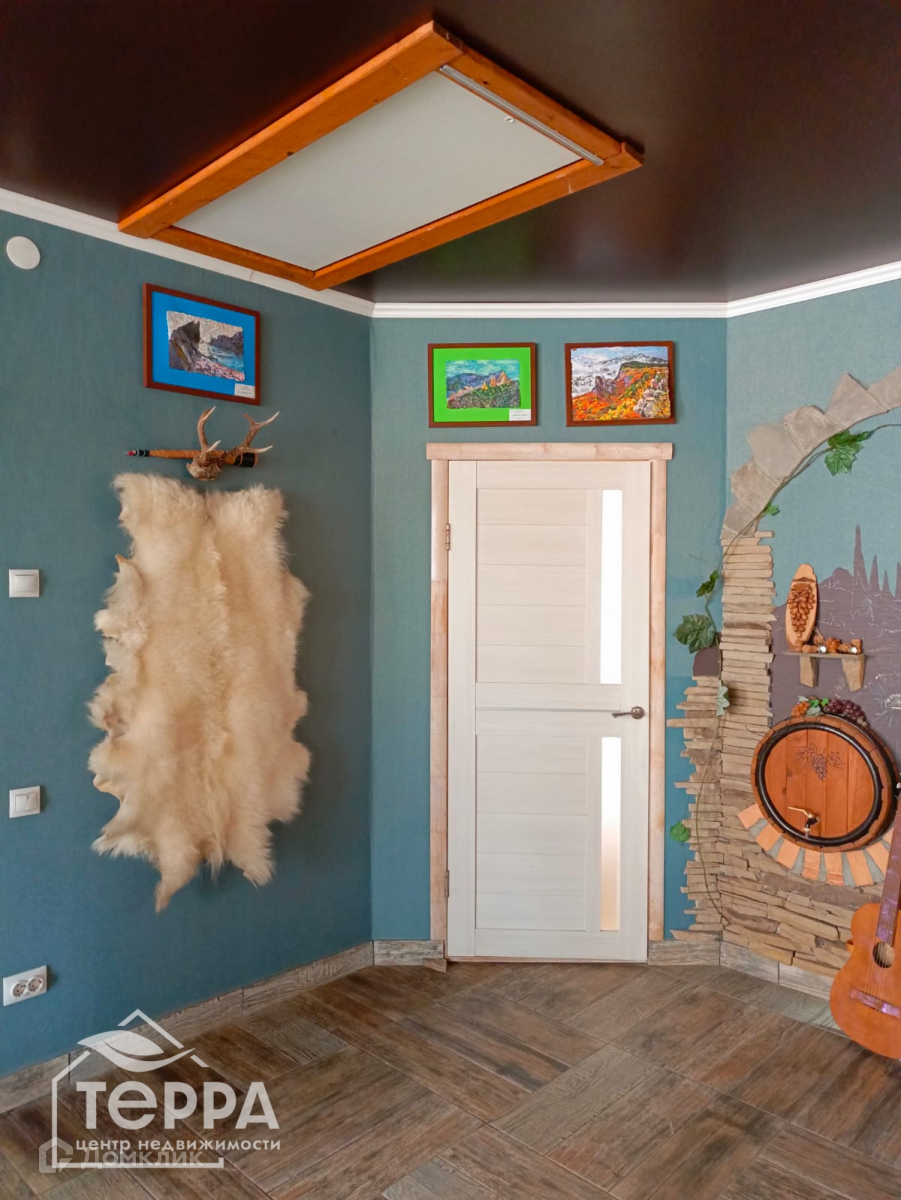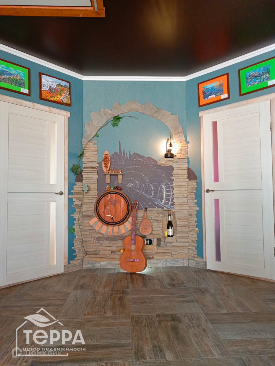 Декоративный камин, стена-пано «Крымский погребок», массивный кухонный стол. В спальнях, на северной стене, панно, нанесенное жидкими обоями.