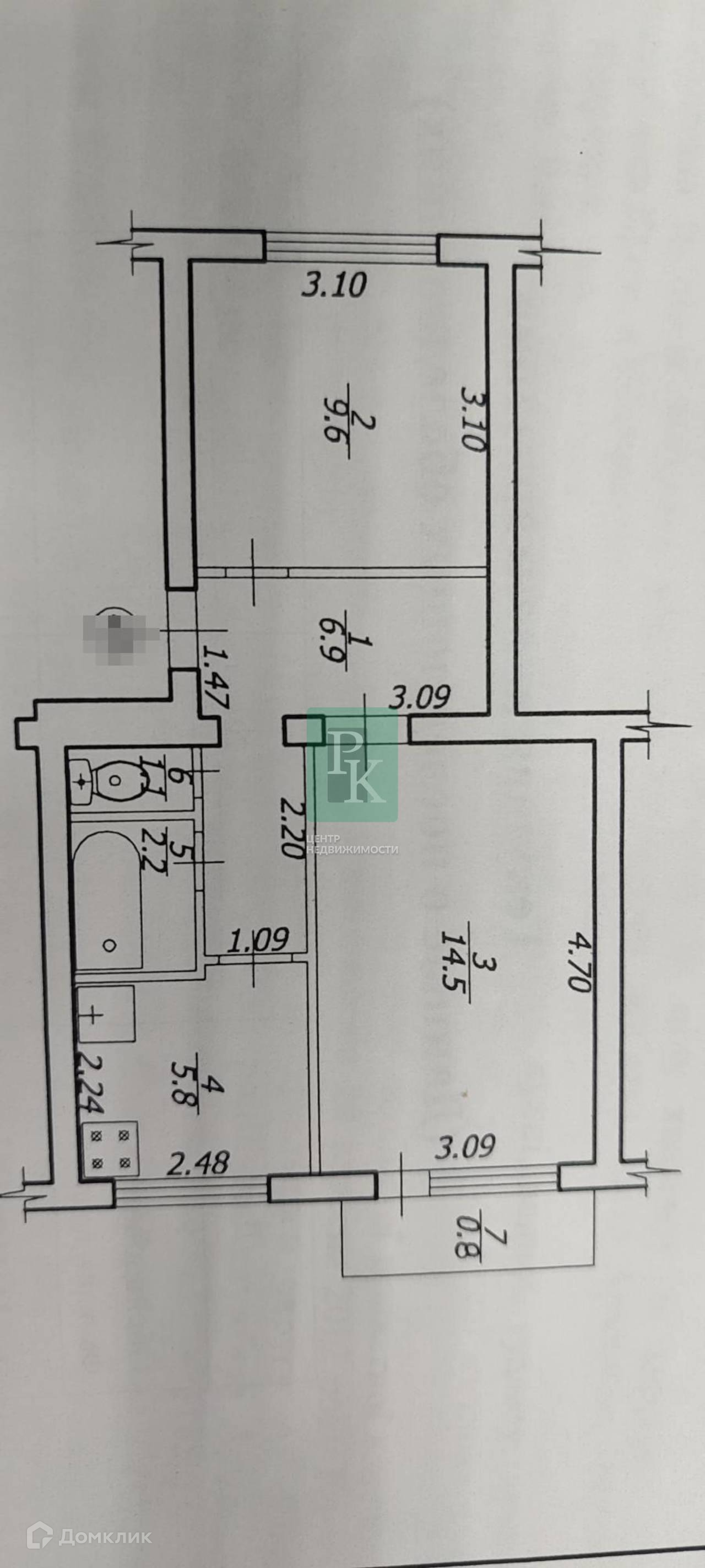 Общая площадь 40,9 м2. Комнаты 14,5 м2 и 9,6 м2; кухня 5,8 м2, санузел раздельный, балкон застеклен.