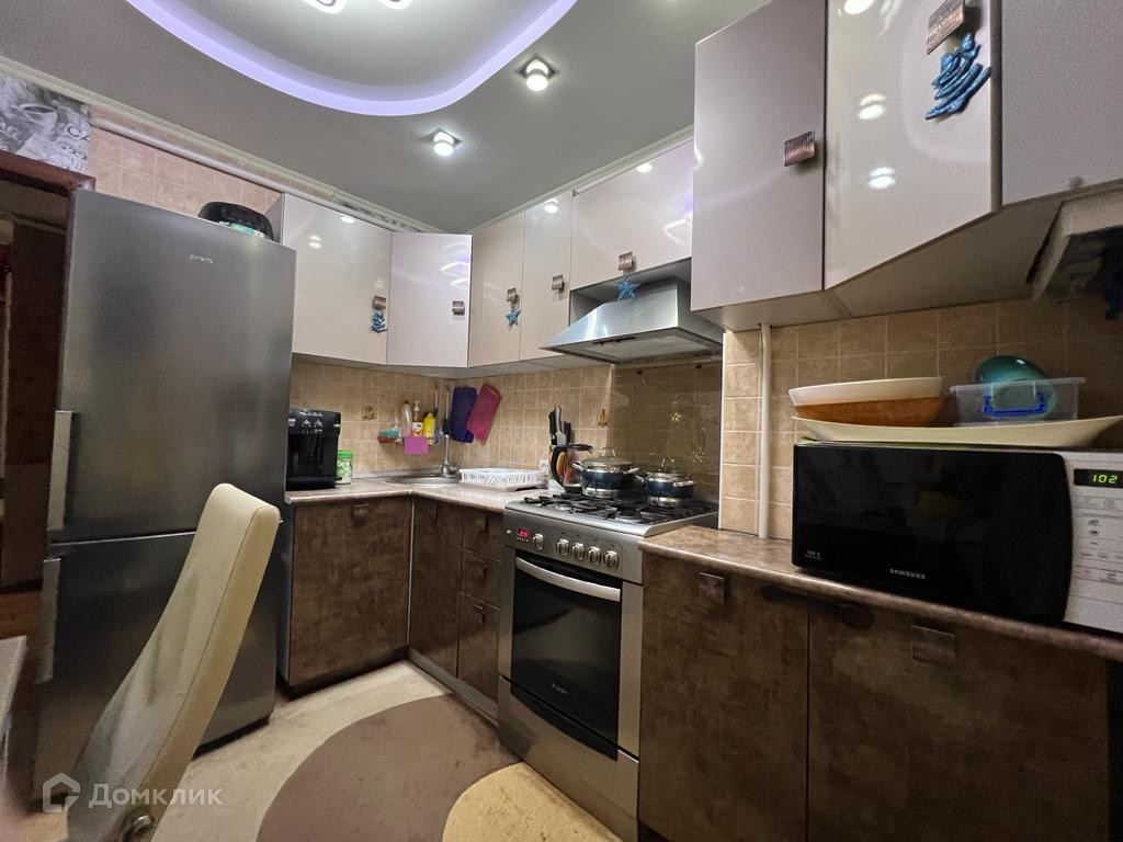 Кухня в квартире оснащена газовой плитой и имеет достаточно места для комфортной готовки.