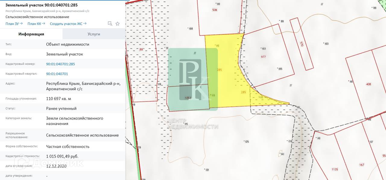 Участок 1100 соток (СТ) расположен в республике Крым, село Ароматное. Участок ровный, правильной формы, с размерами 441м*240м*609м*489м, без уклона. Подъезд грунтовка.