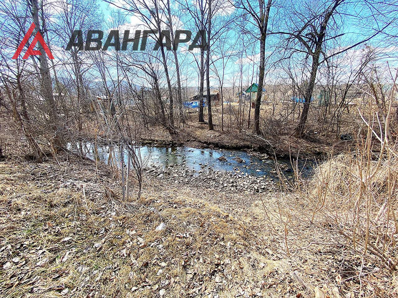 В конце участка расположен ручей, а с переди речка.