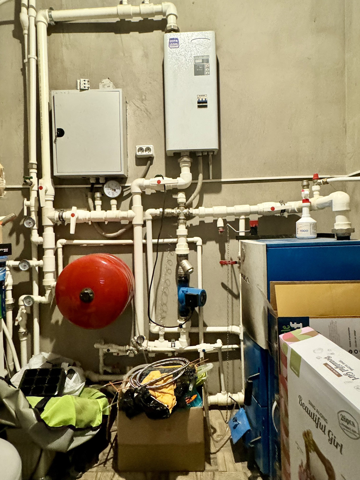 Отопление осуществляется через встроенный водяной пол на первом и втором этаже. В котельной установлены 2 котла ZOTA, электро и твёрдотопливный, работают независимо друг от друга.