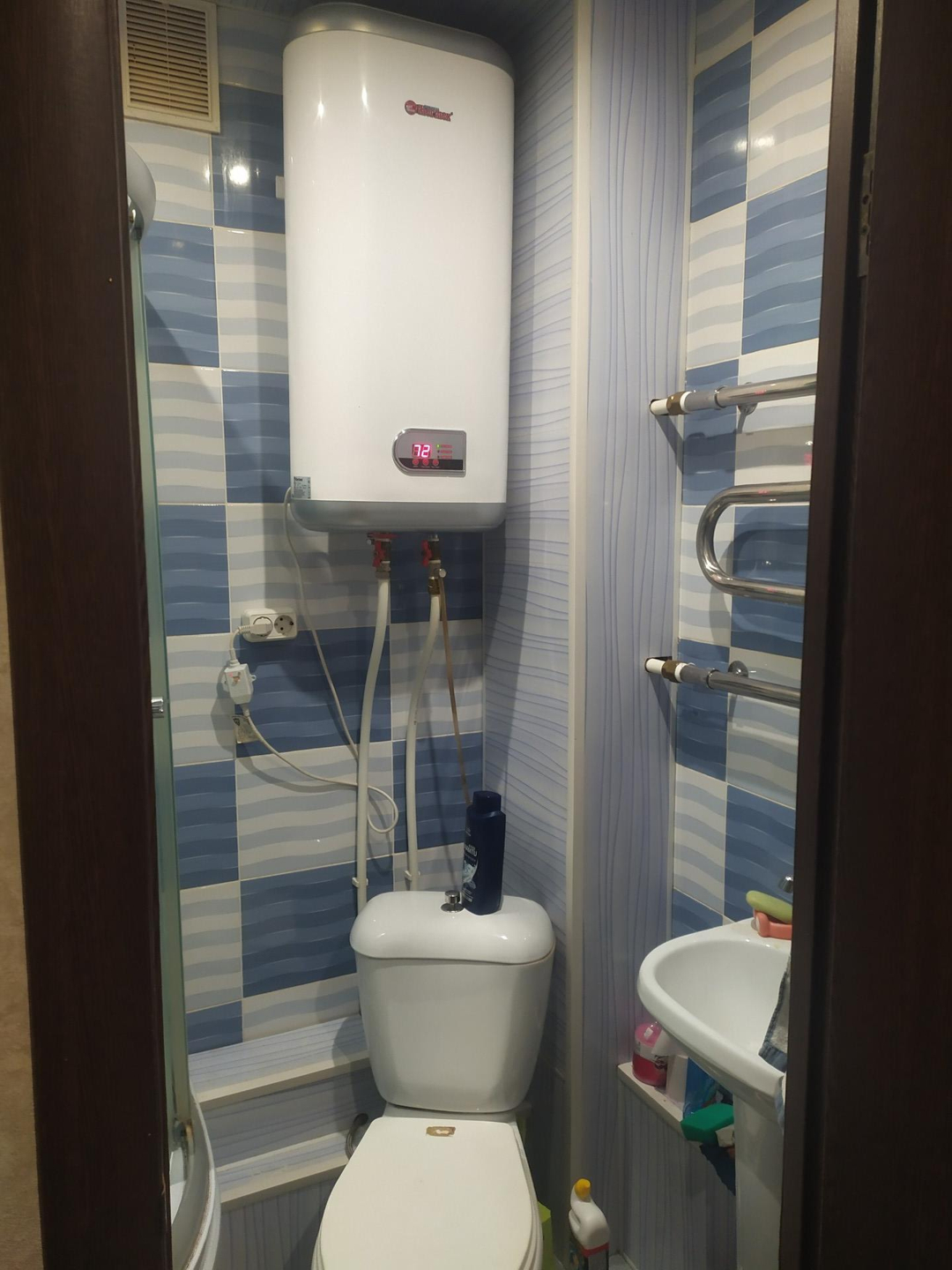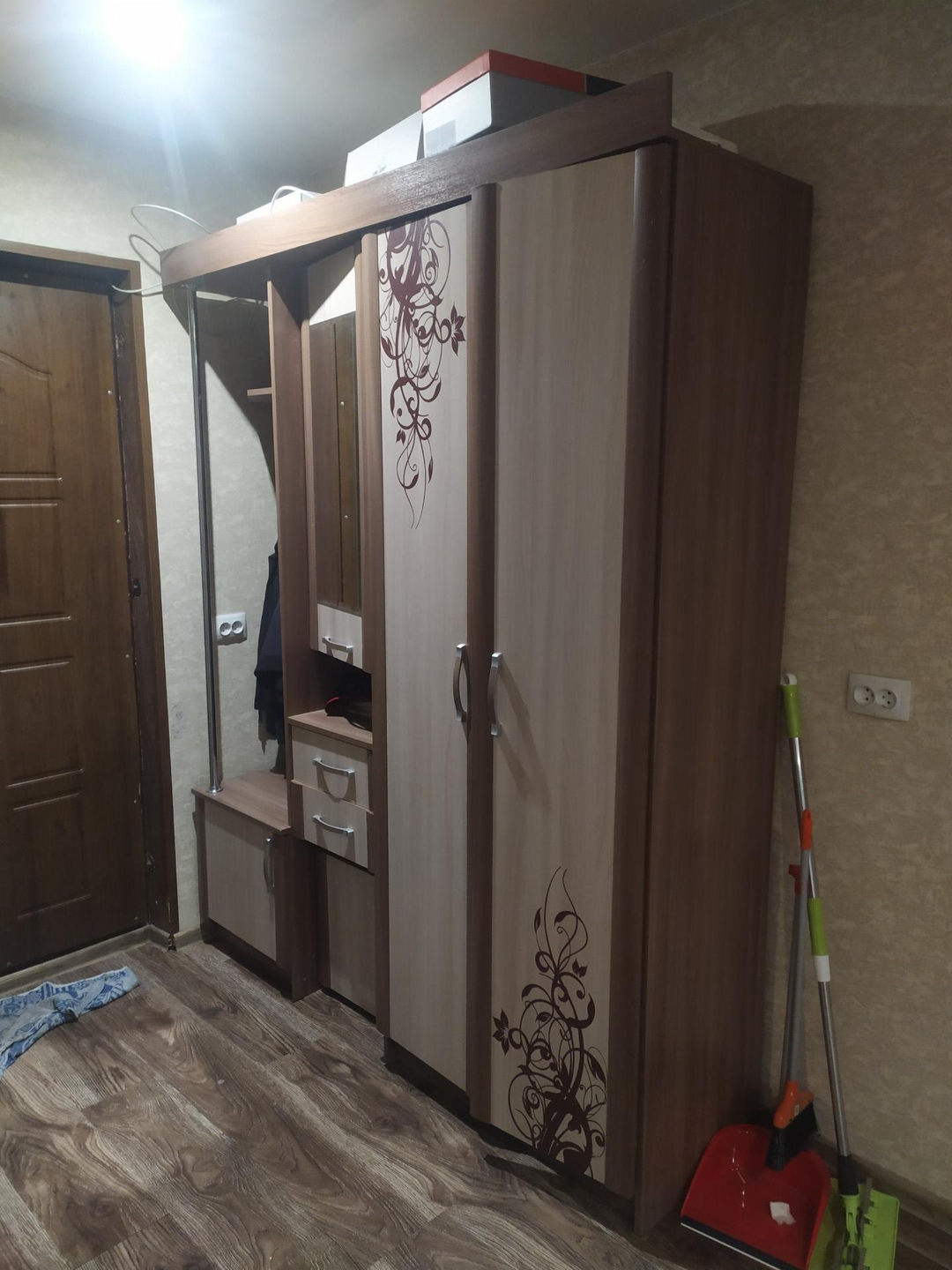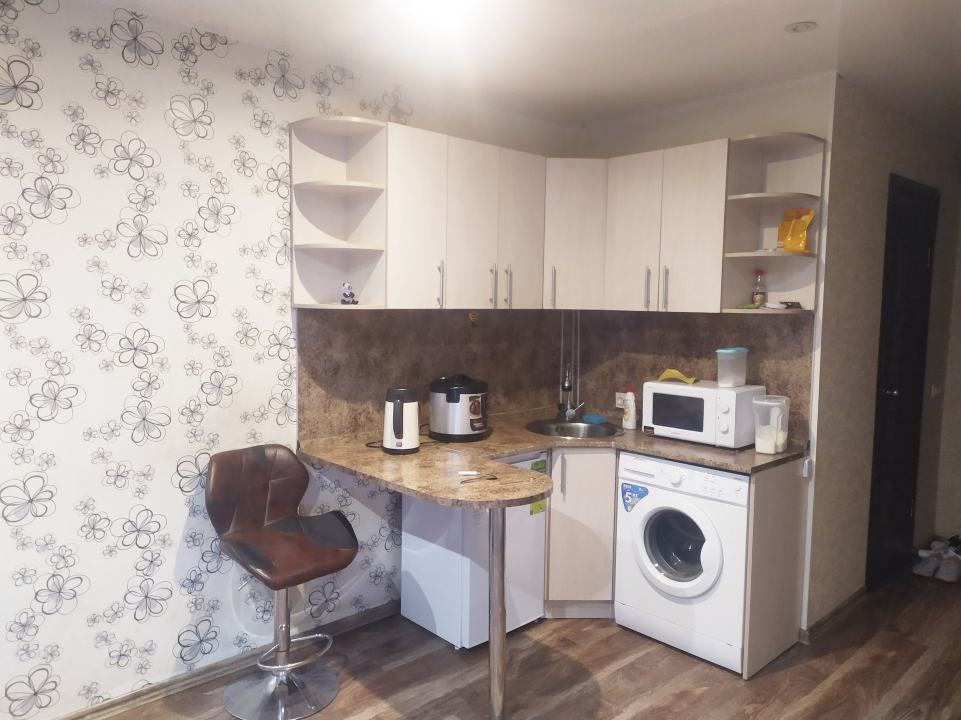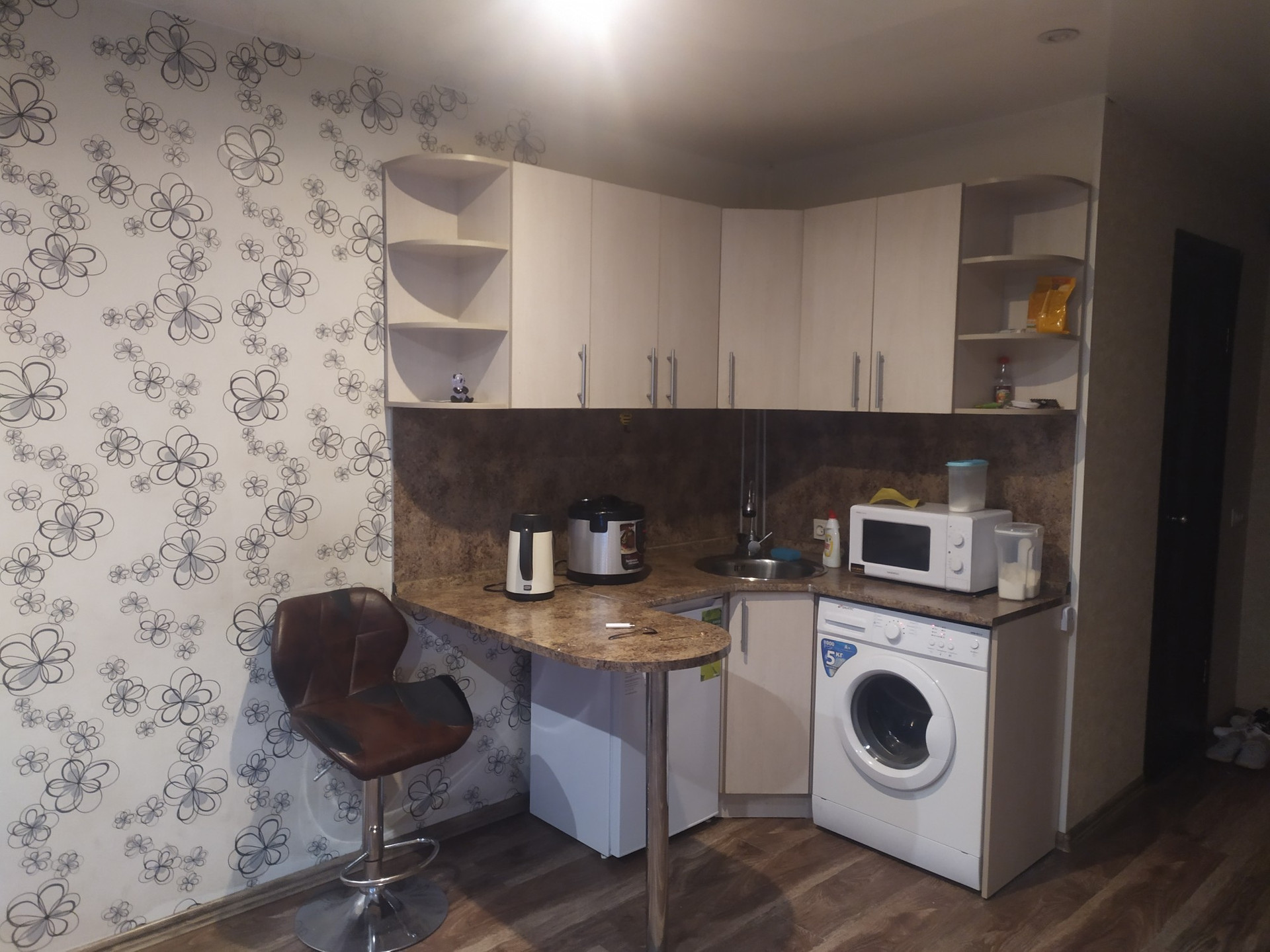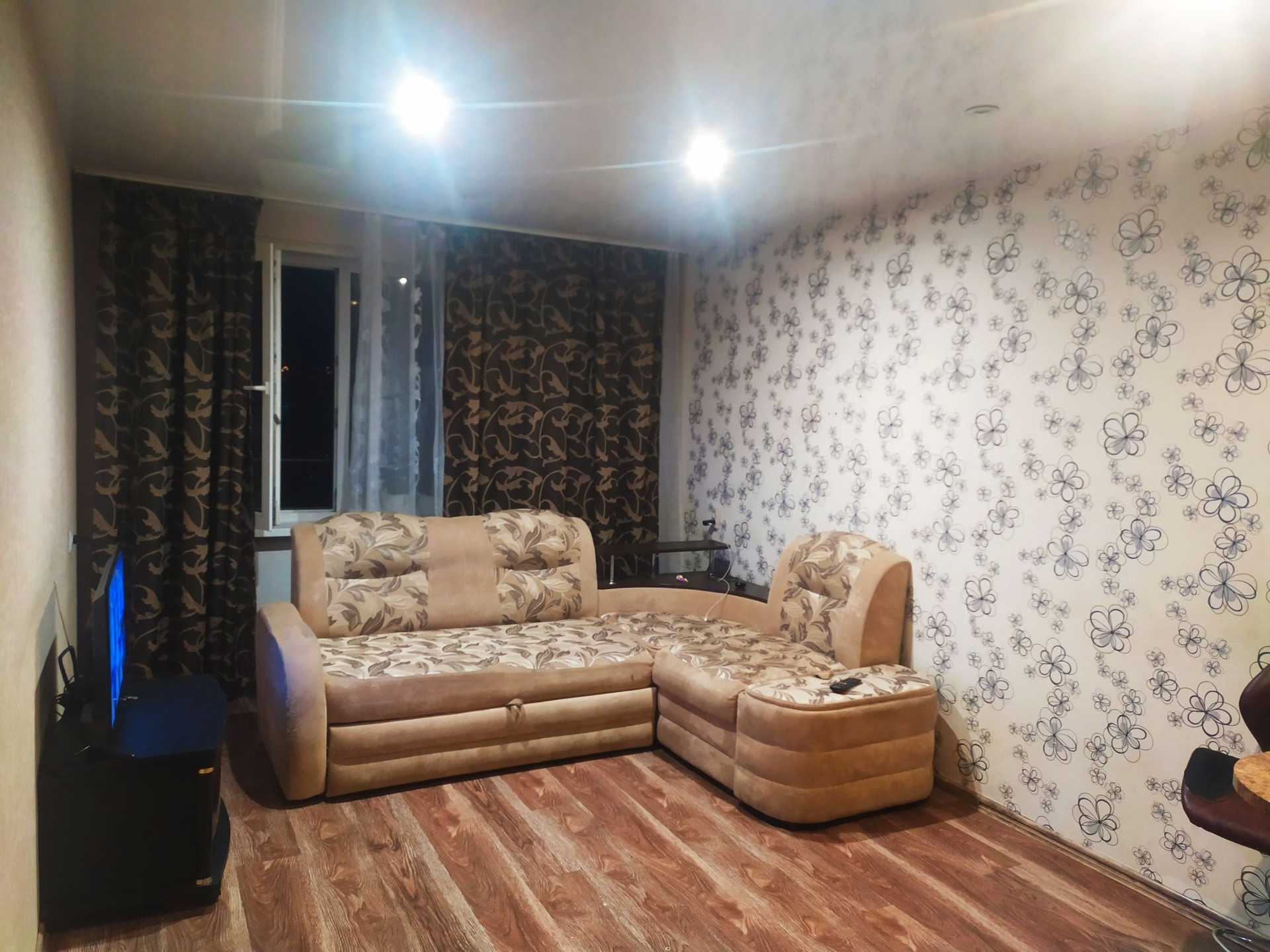 ремонт: на полу ламинат, стены выровнены и оклеяны широкими обоями, натяжные потолки с софитами, санузел под ключ.