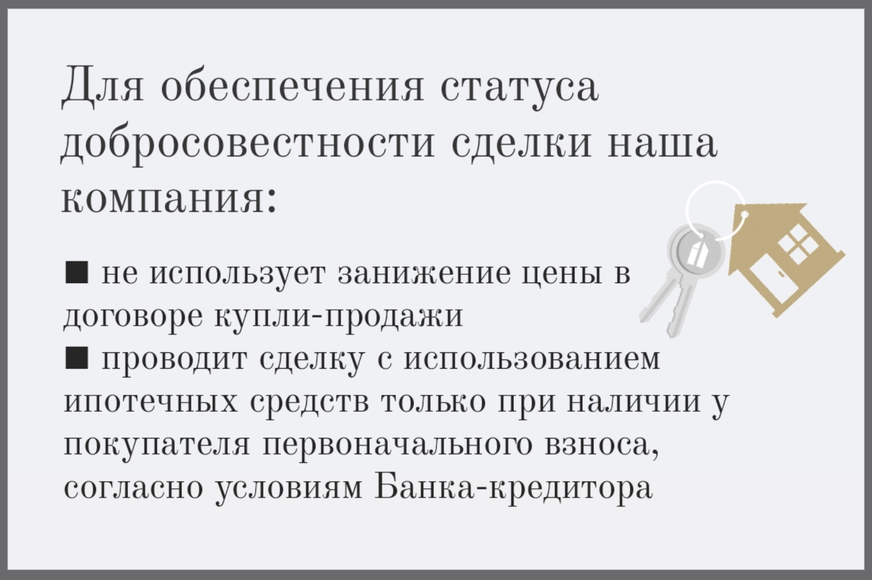 Новому собственнику мы гарантируем статус добросовестного приобретателя и комфортное сопровождение на каждом этапе!
