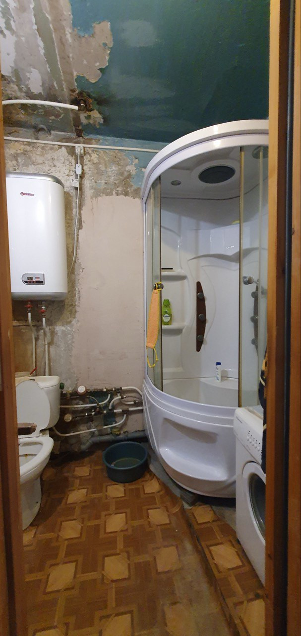 Ванная и туалетная комнаты совмещены. Установлен бойлер на случай отключения горячей воды. Установлена просторная душевая кабина. Кабинка устроена так, что в ней можно принимать душ сидя. А если в вашей семье есть маленькие дети, то можно поставить ванночку. Трубы новые. Установлены счётчики воды.