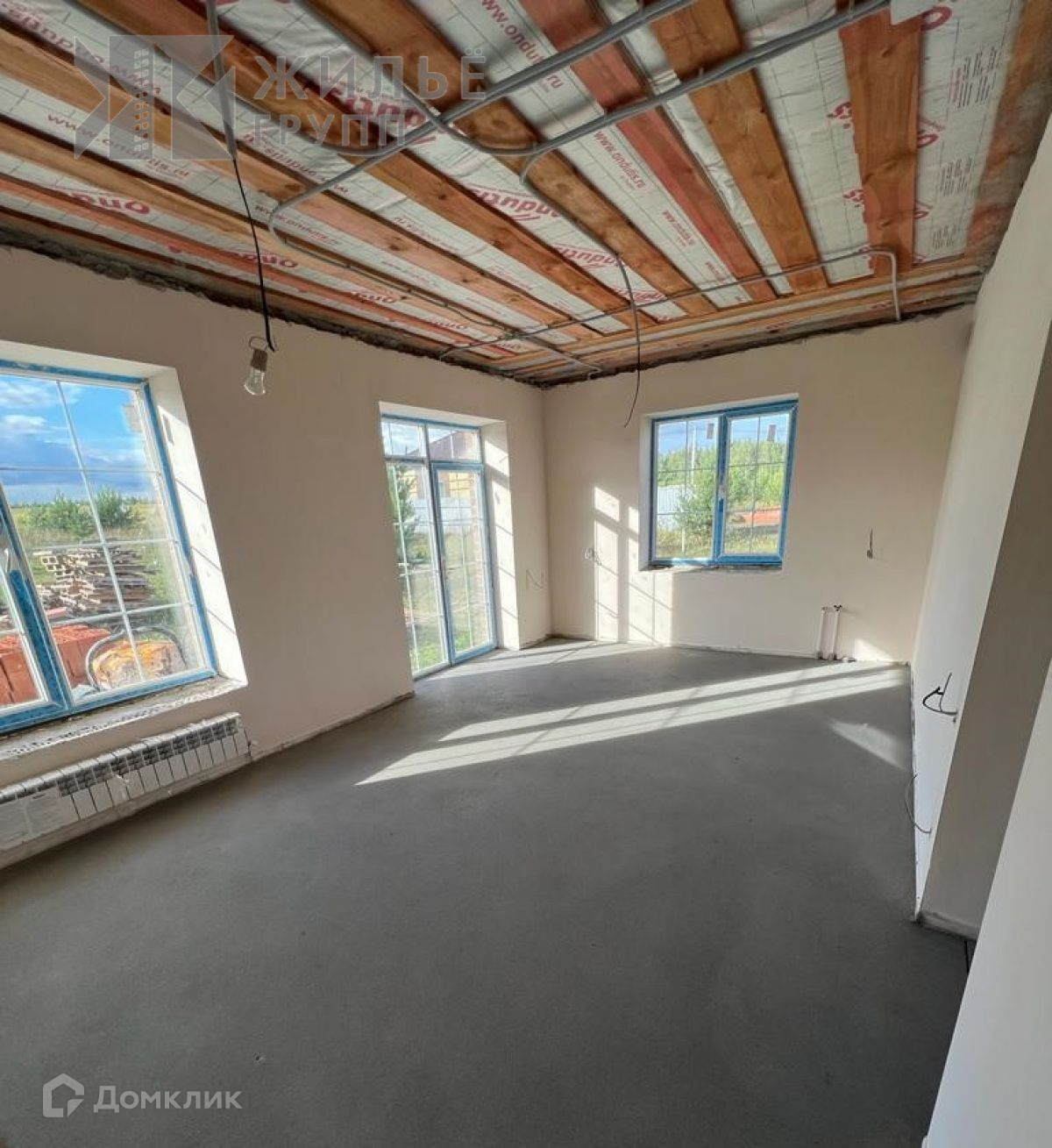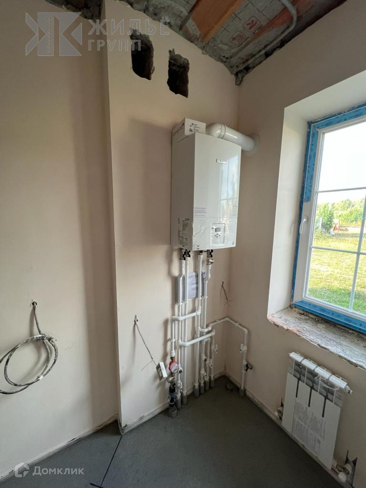2. Предчистовая отделка-штукатурка по маякам, полусухая стяжка пола, разводка электричества, подоконники, подведен газ, установлен газовый двухконтурный котел, теплый пол по всей площади дома, собственная скважина, септик 3 кольца по 1,5 м.
