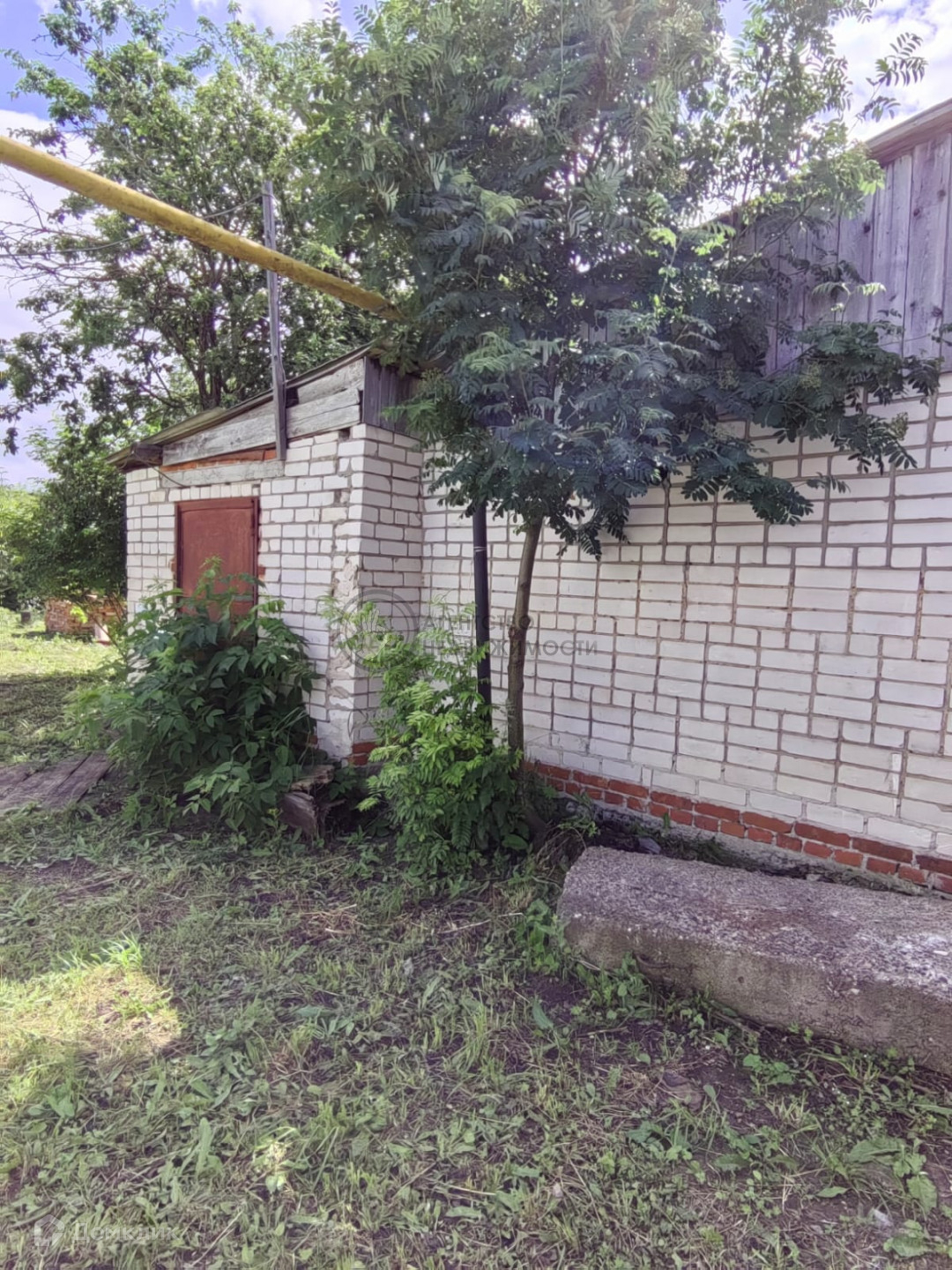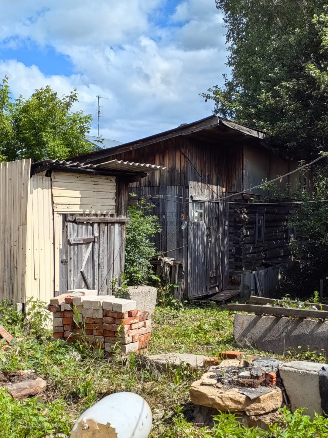 Дом бревенчатый, пристрой кирпичный. Обшит.