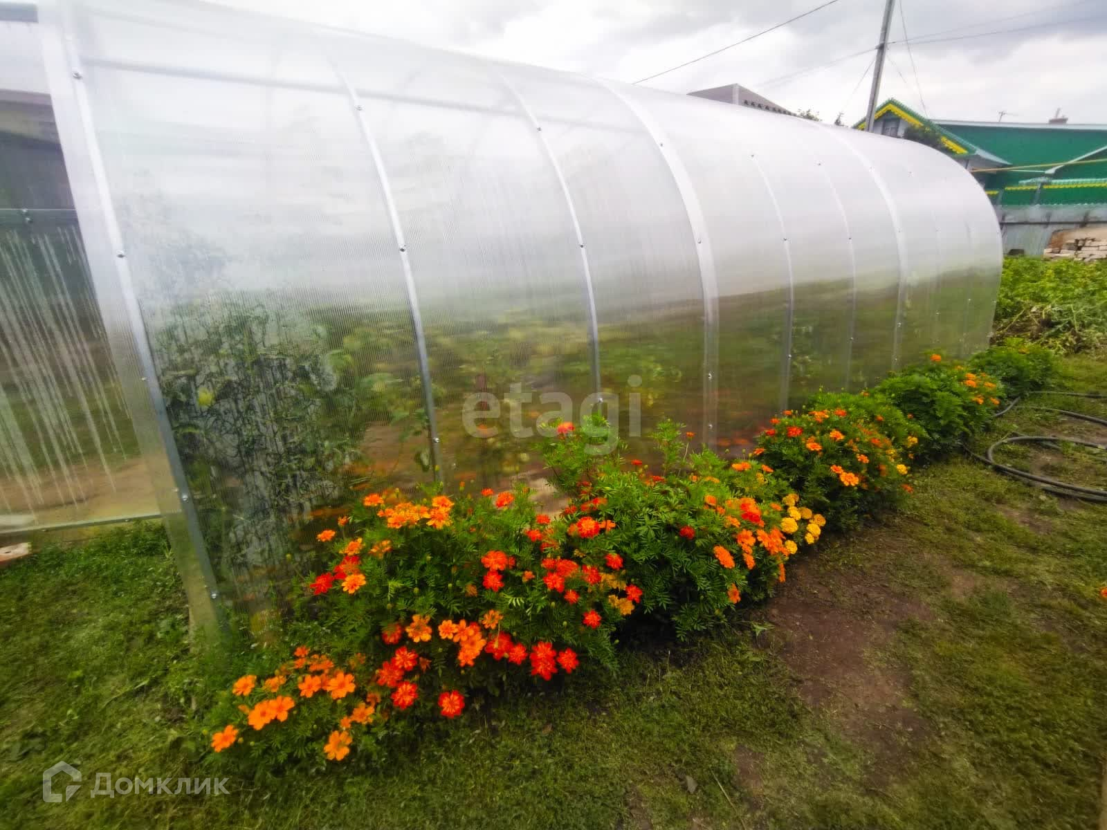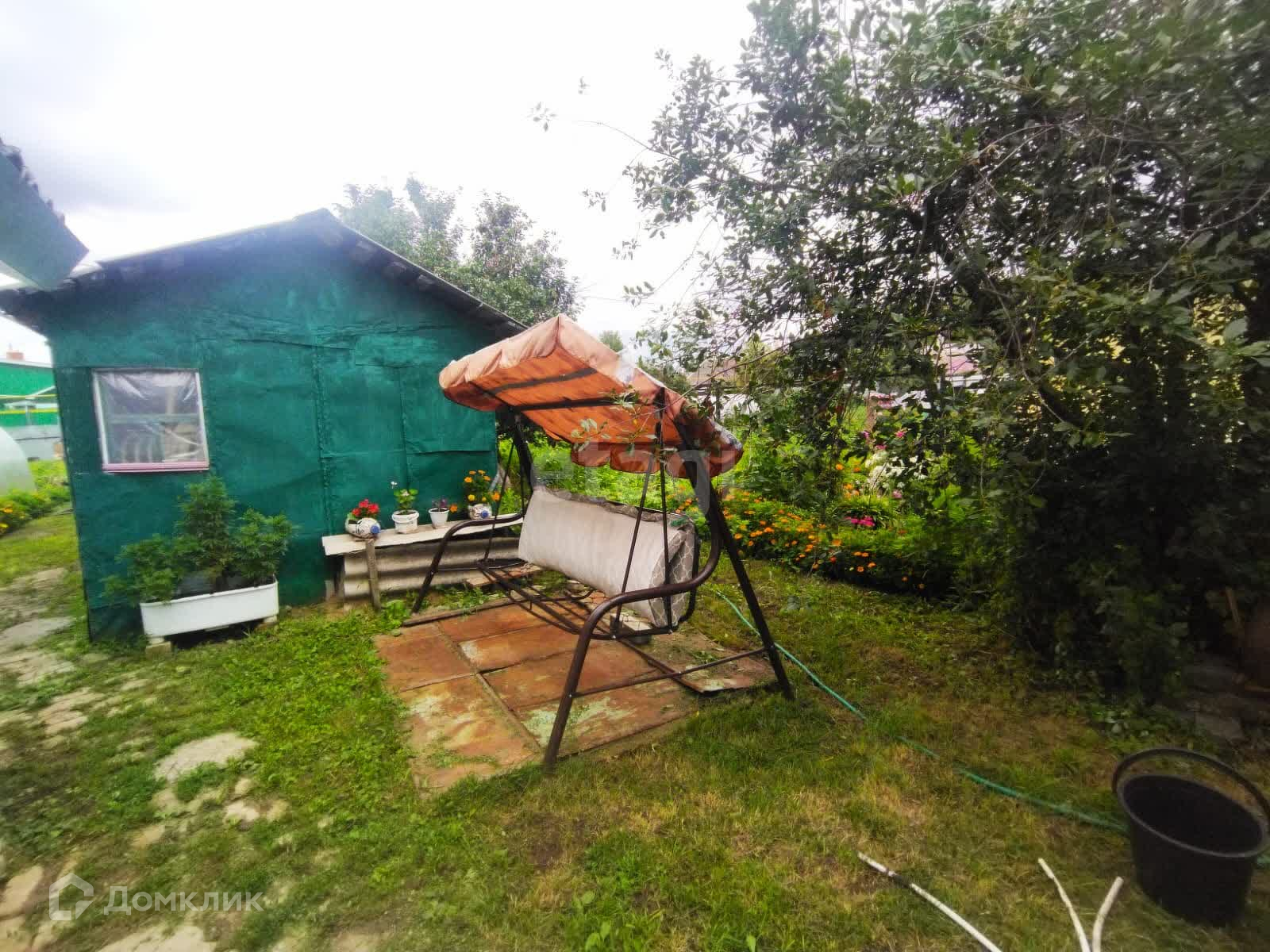 На участке помимо дома находятся сад с фруктовыми и плодово-ягодными деревьями и кустарниками, огород (с парником), небольшая зона отдыха, летняя душевая и хозяйственная постройка.