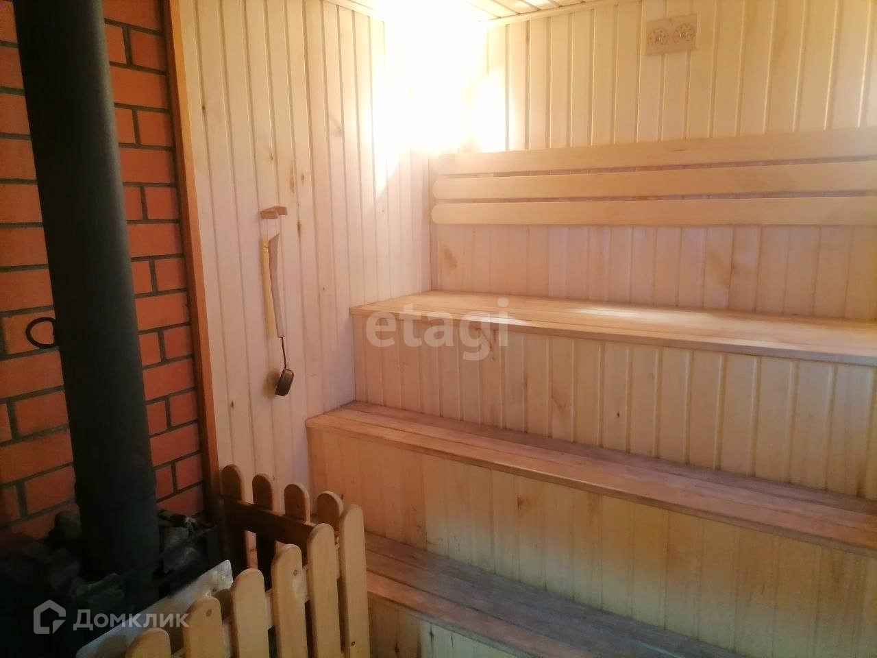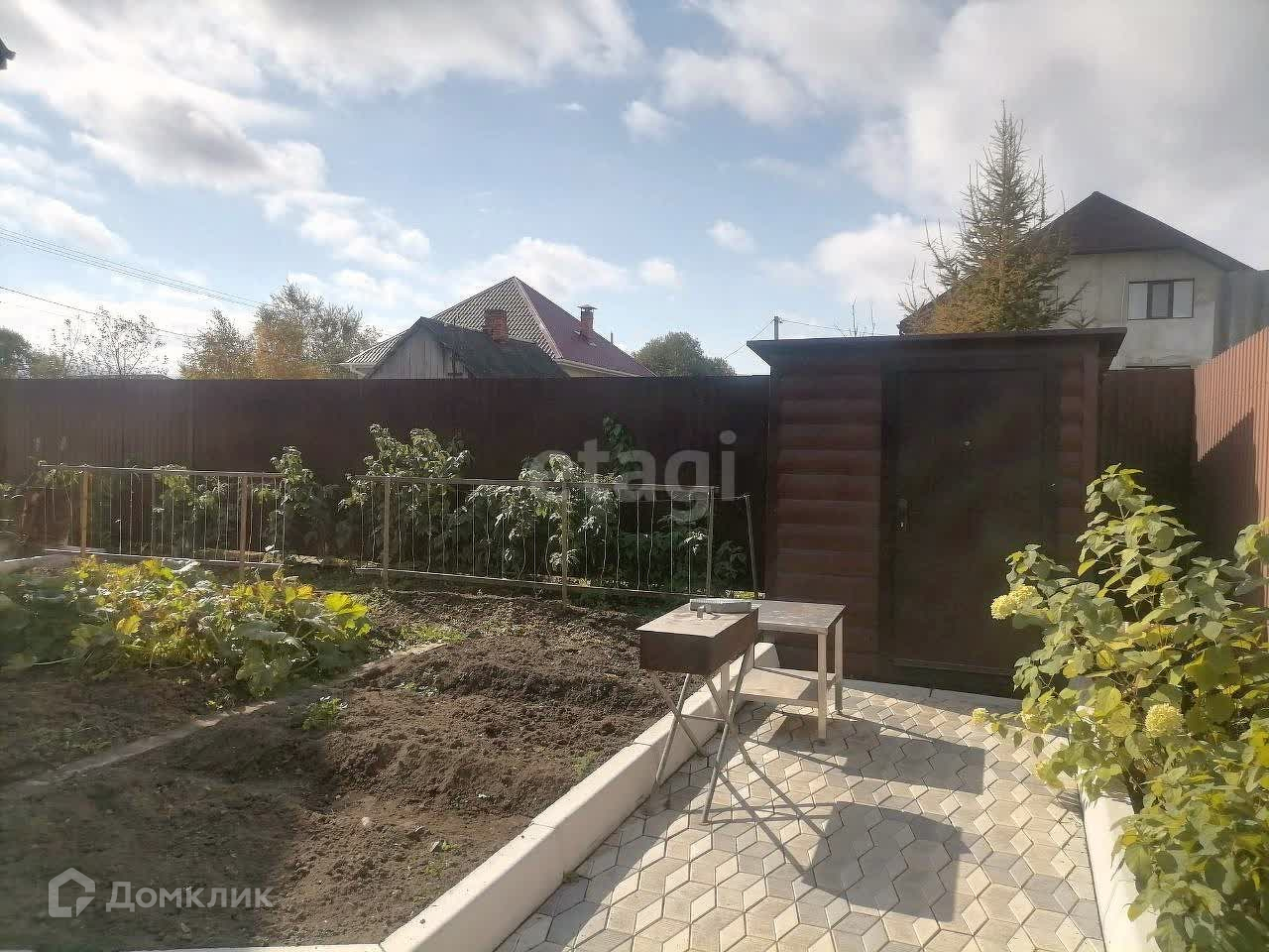 Территория коттеджа грамотно спроектирована: на 6-ти сотках земли размещен большой гараж на три машино-места, сауна и участок для садово-огородных занятий.