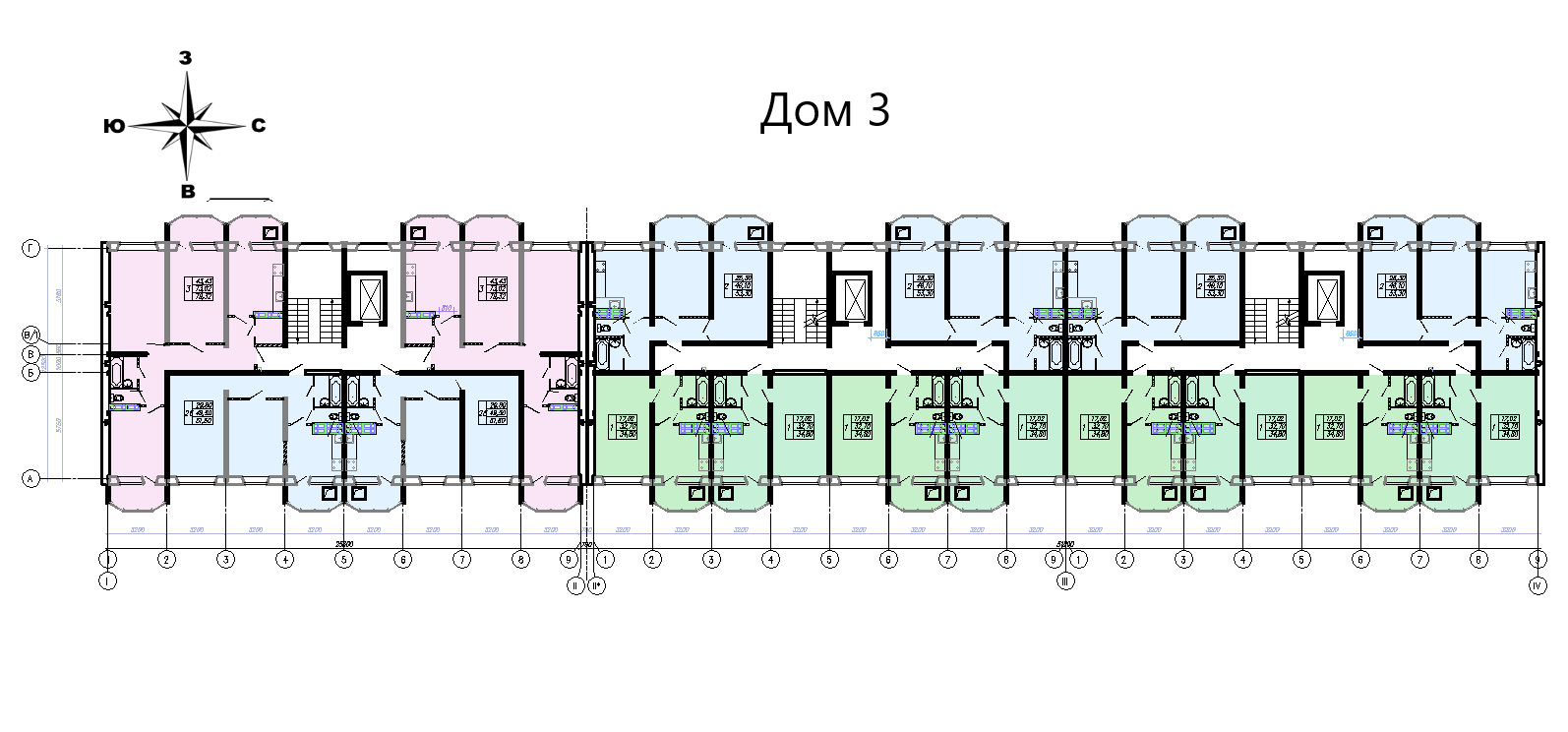 * Третья секция – по 2 двухкомнатных и 2 трехкомнатных на каждом этаже.
