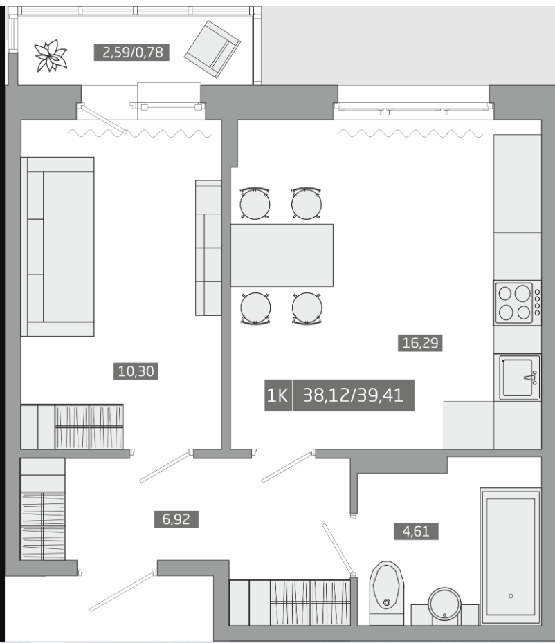 Общая площадь 39.41 м2